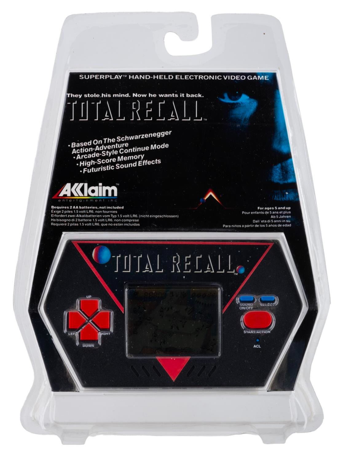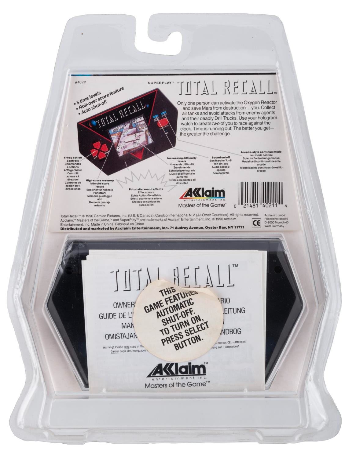 (Akklaim, 1990) A rare “Total Recall” Superplay Hand-Held Electronic Video Game, sealed in the original packaging. The game requires two “AA” batteries (not included), and is presumed in fine condition.