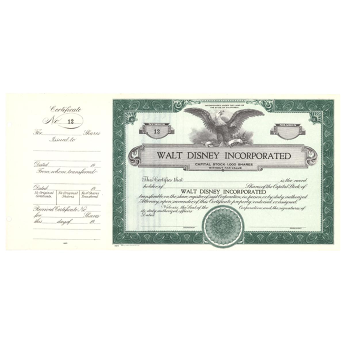 ----, California. Unissued 1950’s stock certificate. Vignette of a spread eagle at tope center. Litho. Formed in the early 1950’s this company was created by Disney with the dream of building a theme park in California. Now known as Disneyland, it rem