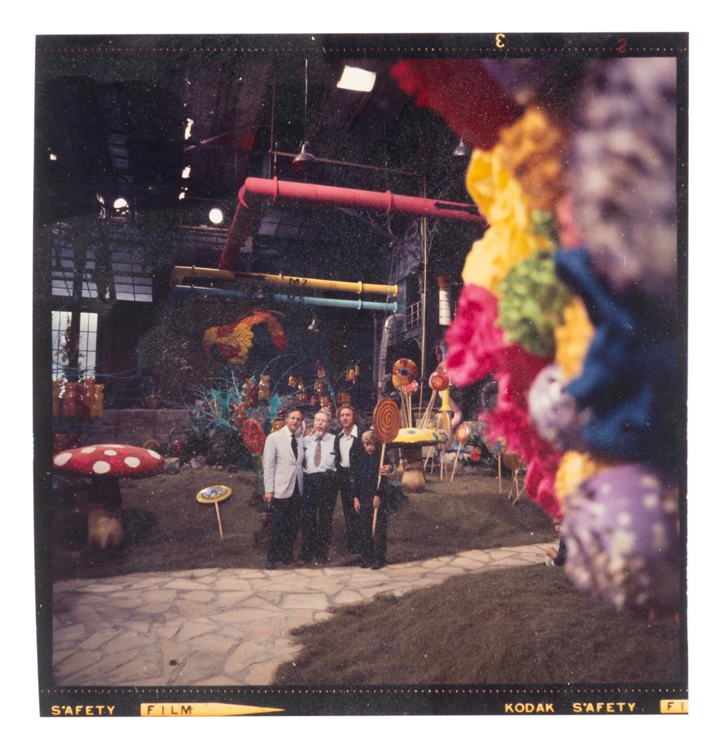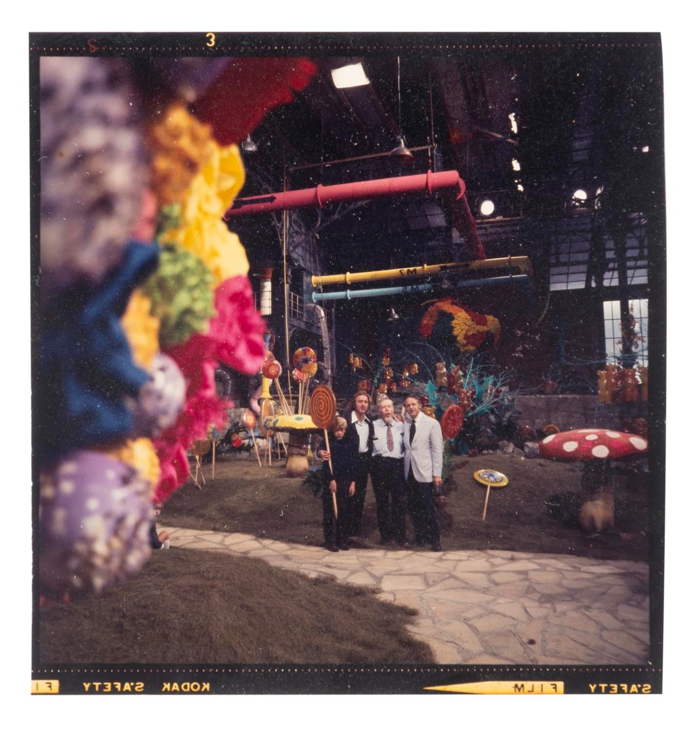 (Paramount, 1969) A very rare original color transparency taken on the set of"Willy Wonka and the Chocolate Factory." The image shows the set for the Chocolate Room with soundstage ceiling above, and Gene Wilder (Wonka) and Peter Ostrum (Charlie) pose for the camera along with set designer Harper Goff and another man. Measuring 2.5" x 2.25", the transparency is in very good condition with slight handling wear, including small creases that do not appear to affect the image.