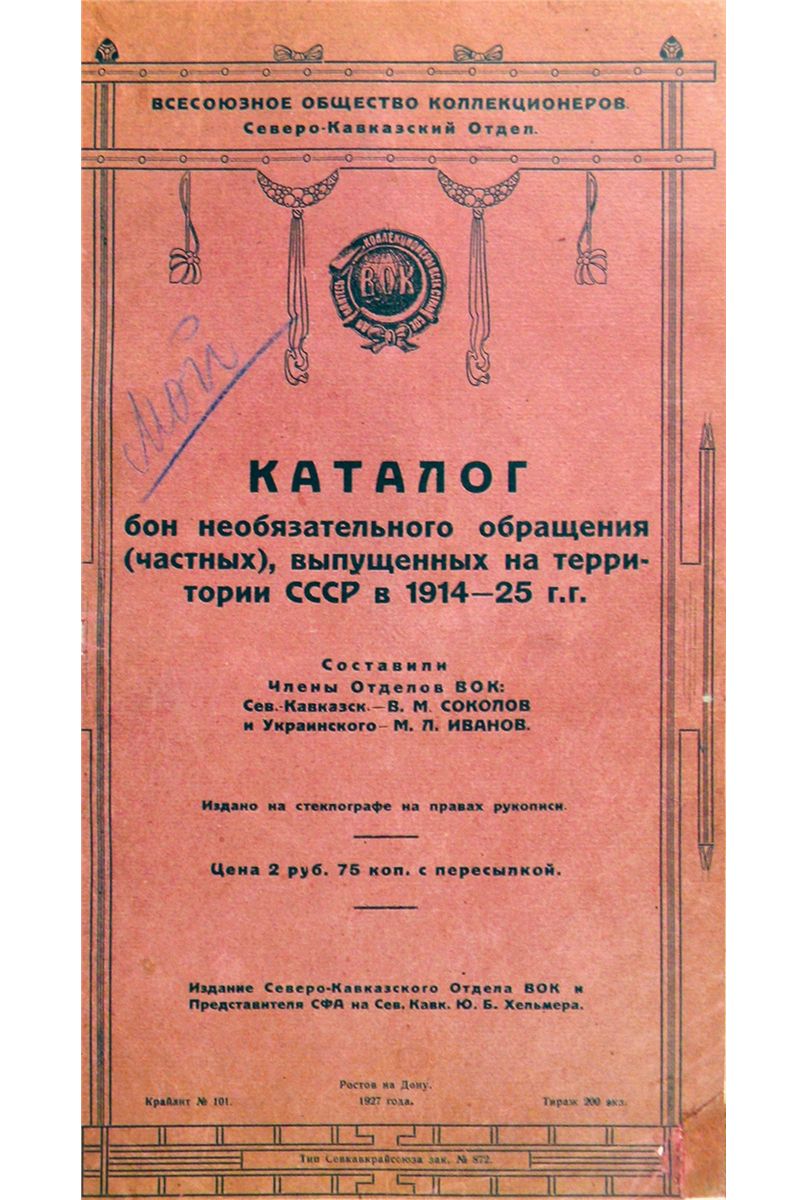 Sokolov, V.M., and M.L. Ivanov. КАТАЛОГ ЧАСТНЫХ БОН ДЕНЕЖНЫХ ЗНАКОВ НЕОБЯЗАТЕЛЬНОГО ОБРАЩЕНИЯ ВЫПУЩЕННЫХ НА ТЕРРИТОРИИ СССР В 1914–1925 Г.Г. Rostov-on-Don, 1927. First edition. Folio [35 by 23.5 cm], later tan leather; original printed front card cover mounted and bound in. (3) leaves; xiii, (1) pages; 77, (1) pages, interleaved; 7, (1), 8, v, (1) pages. Some annotations. Some tape repairs to margins. Very good or so. A very rare work.