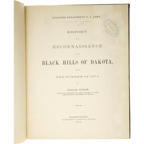 <B>William Ludlow: Featuring Three Folding Maps:<I>Report of a Reconnaissance of the Black Hills of Dakota,</B></I></B></I><B> made in the Summer of 1874. By William Ludlow, Captain of Engineers, BVT. Lieut. Colonel U.S. Army, Chief Engineer Department of Dakota. Engineer Department, U.S. Army .</B></I> (Washington: Government Printing Office, 1875). First edition. Quarto (11.5” x 9”). Illustrated with an engraved plate of fossils, two folding maps and a folding geological map. 121 pp. Publisher's original cloth, bordered in blind on the boards and lettered in gilt on the spine. Binding a bit worn at the edges, and with the cloth on a portion of the front board discolored and rippled, short tear at the bottom of the front joint. Tears to a couple of the maps. Ex-library copy, with an ink stamp on the title page and a paper label on the backstrip. Hinges cracking but still sound. Altogether, a good copy of this report on the Black Hills of Dakota.<BR><BR><b>Shipping:</b> Books & Catalogs (<a target="_blank" href="http://www.heritageauctions.com/common/shipping.php">view shipping information</a>)