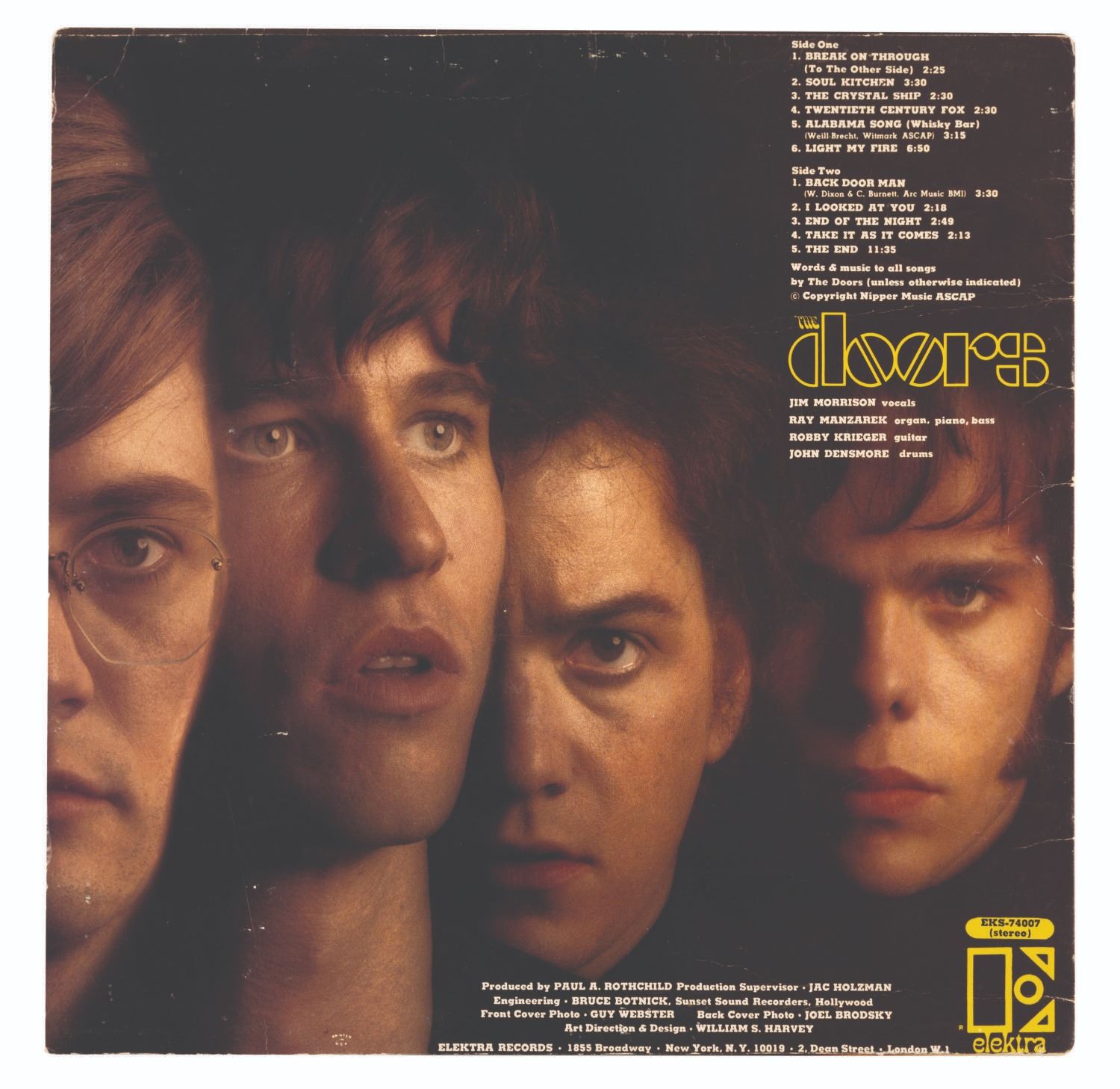 (TriStar, 1991) A prop vinyl record sleeve from Oliver Stone’s "The Doors,” a biopic starring Val Kilmer as Jim Morrison. Designed to replicate the cover of the band’s 1967 debut album, the sleeve features Kilmer, Kevin Dillon as John Densmore, Kyle MacLachlan as Ray Manzarek, and Frank Whaley as Robby Krieger. Measuring 12.25” x 2.25”, the sleeve is in good production-used condition with edge wear and creasing.