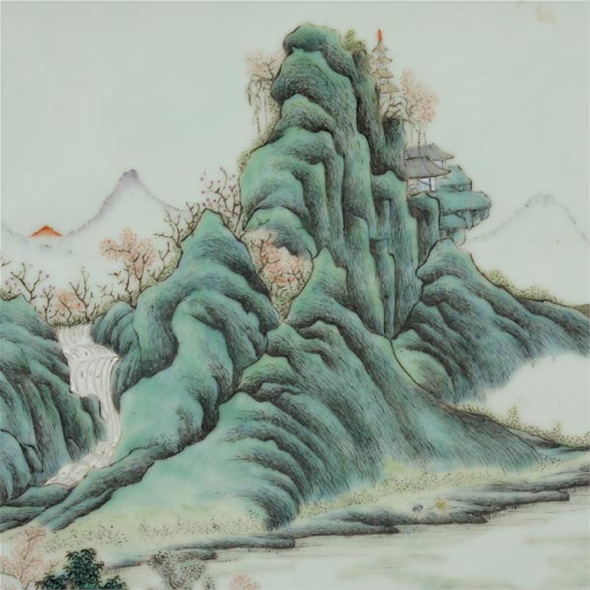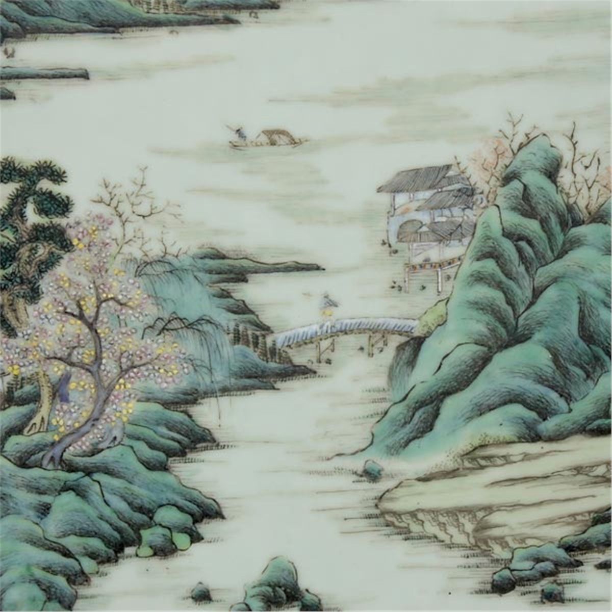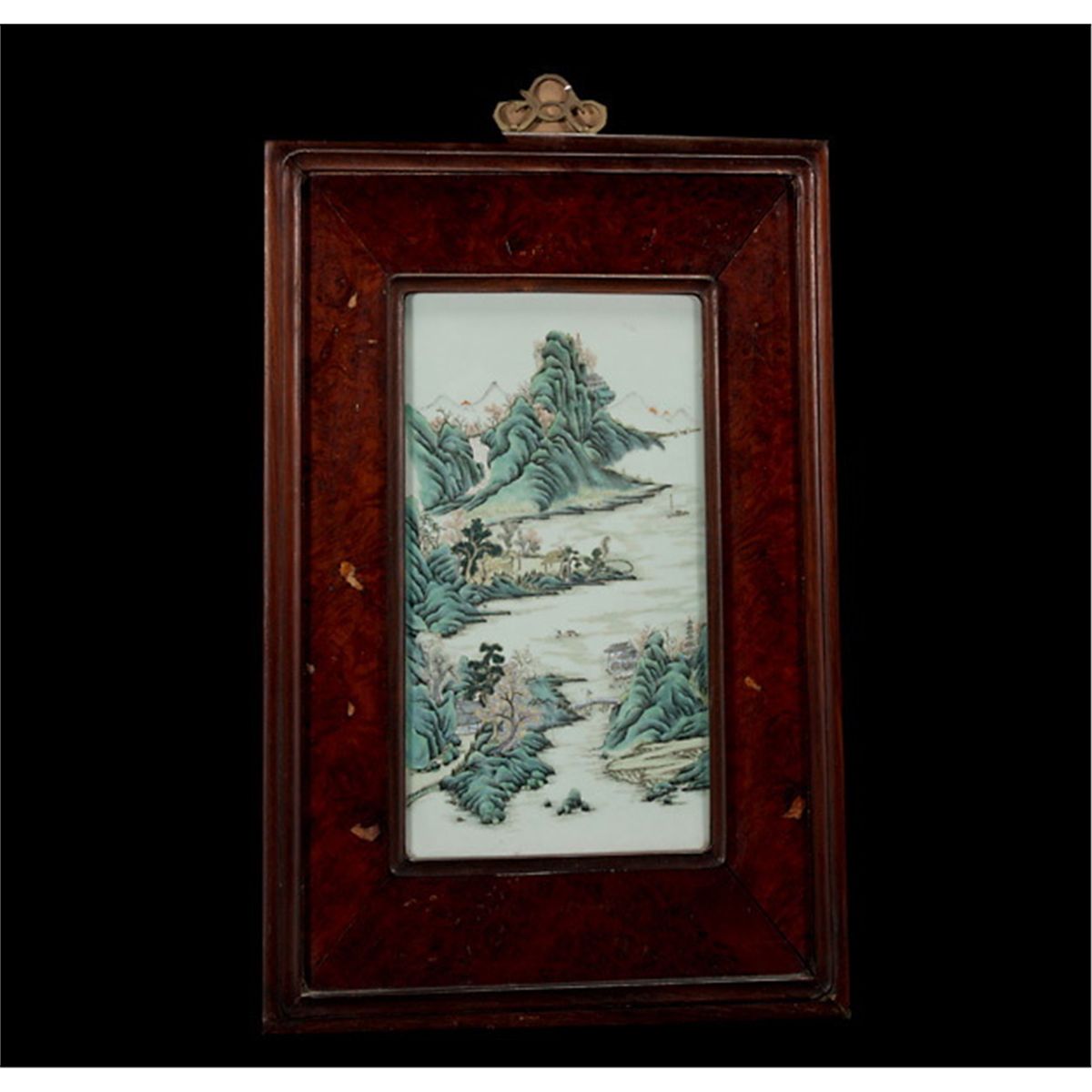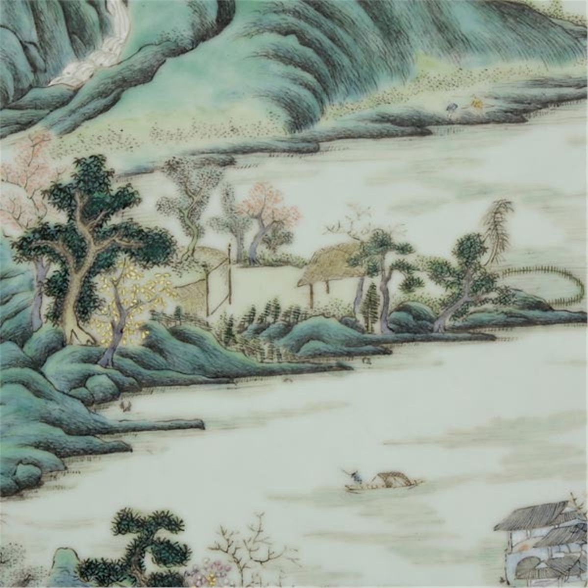 A Rectangular Porcelain Plaque, Painted with figures, buildings, trees, rockwork and boats, in mountain and river scenes, within a wood frame. Late Qing Dynasty, 28 x 19 1/4 inches (71 x 49 cm) Provenance: Acquired from Sotheby's, Hong Kong, November 4, 1974, Lot 137.