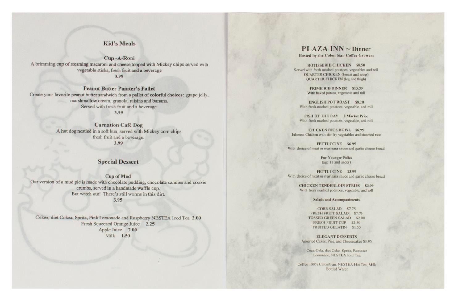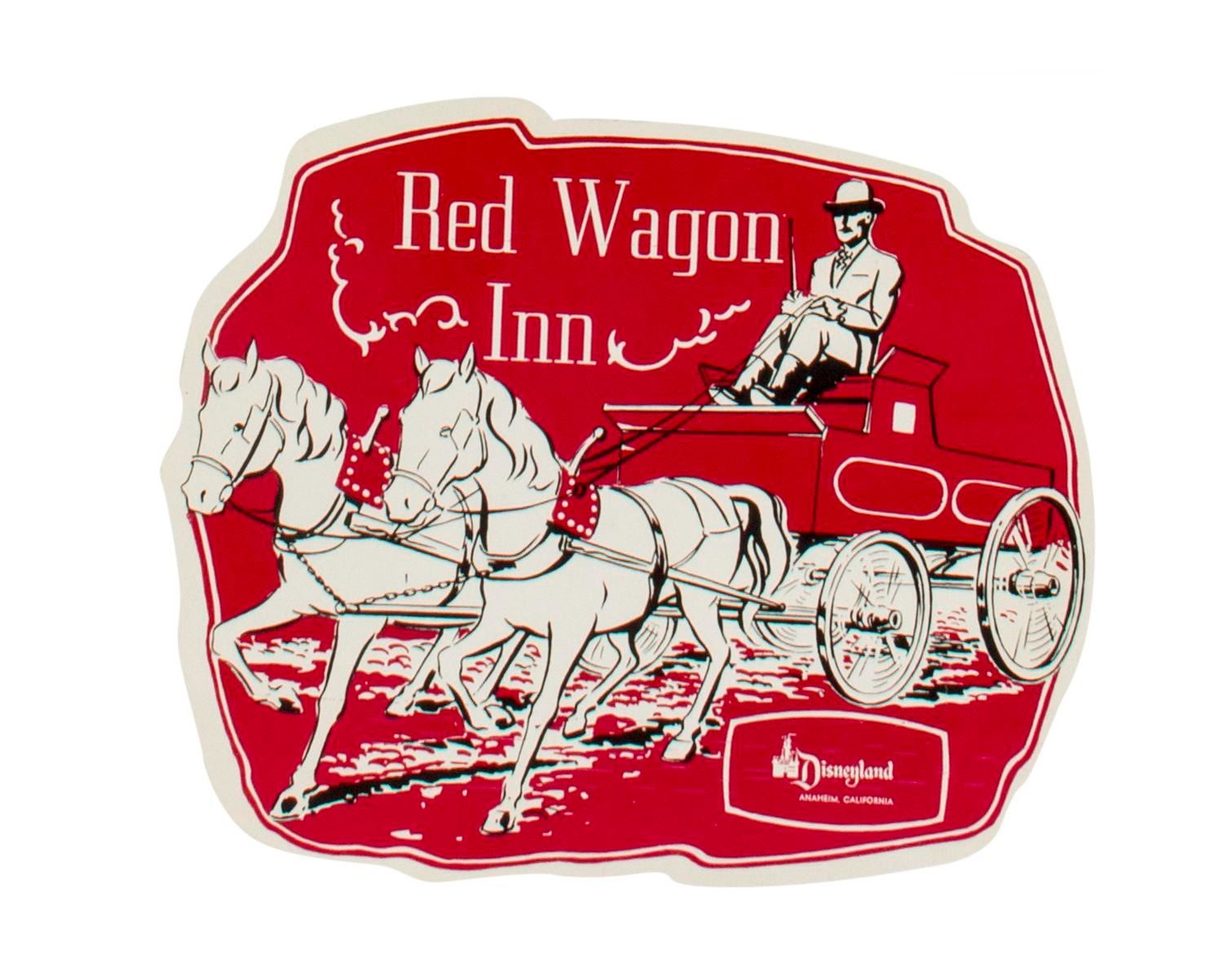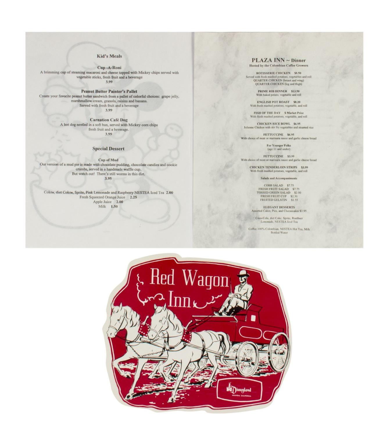 (Disneyland, 1957/1990s) A child's menu from Disneyland's Red Wagon Inn. These stylish menus are highly sought after for the small changes to the menus over the years. For example, this menu reads "Red Wagon Inn" on the front, but around 1959, the name changed to "Red Wagon Restaurant." Additionally, this menu includes characters Si and Am from "Lady and the Tramp" as well as Danny from "So Dear to My Heart," where other menus included characters like Monstro and Pluto. Measuring 8" x 9.5", the menu is in very good condition with some minor edge wear from use. Included with the menu are two sheets of menu options from the 1990s "Plaza Inn," which took the place of the "Red Wagon Inn" in 1965.