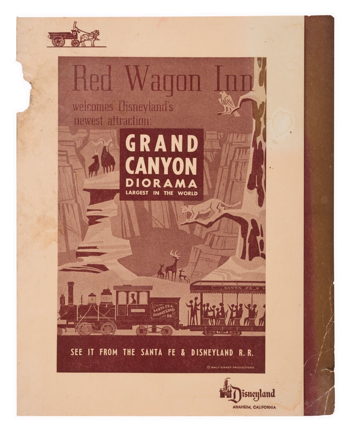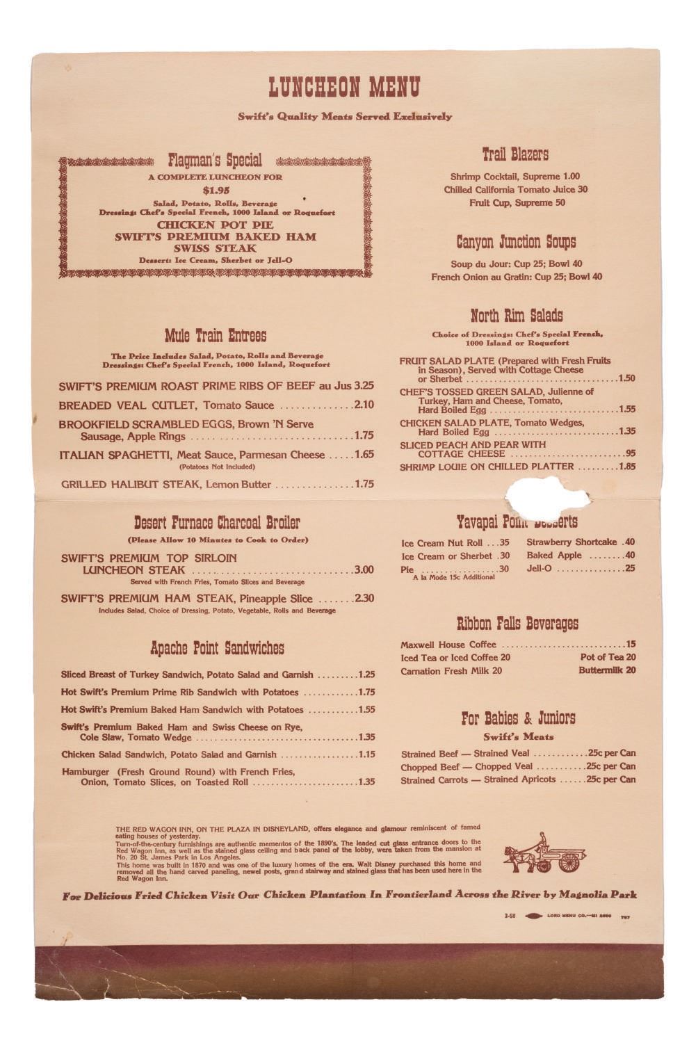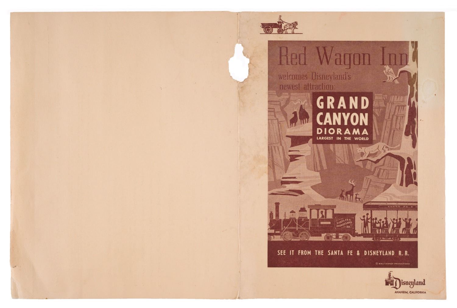 (Disneyland, 1958) A rare Red Wagon Inn Lunch Menu. The menu notably gives information on the origin of the elegant restaurant furnishings and features a cover and menu options inspired by the recently opened Grand Canyon Diorama. Measuring 12"x9.5", the menu is in good condition, despite a 1.75"x1" tear to the spine (affecting menu interior) , spots of discoloration and wear to edges and corners.