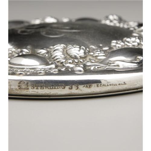 <B>An American Silver Hand Mirror</B></I><BR><B>Redlich & Co., New York, NY, Early Twentieth Century</B></I><BR><BR>Script monogram to the reverse <I>EW,</B></I> retailed by J. E. Caldwell, hallmark to the side with <I>STERLING 35 PAT. J.E. CALDWELL & CO.</B></I><BR>10.4in. long x 5.5in. wide1 Items <BR><BR><B>Condition Report:</B> Normal signs of wear as appropriate with age; the silver backing on the glass is slightly antiqued.