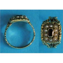 A Regency 18ct gold ring, set with an amethyst in a border of pearls within chased borders and shoulders, inscribed 'Susn. Woodbridge Obt 10 Oct 1824' £100-150
