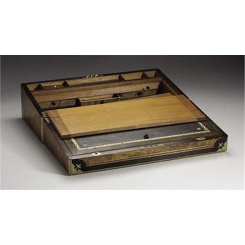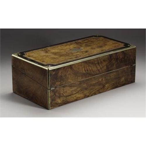 <B>A Regency Burl Walnut and Brass Lap Desk<BR></B></I>Unknown maker, England<BR>Circa 1800-1820<BR>Burl walnut, rosewood, ebonized wood, brass<BR>Unmarked <BR>7 inches high x 20 inches wide x 10.25 inches deep (closed)<BR> <BR>With burl walnut ground, the top and front with ebonized border with incurving corners, with band of rosewood between brass stringing, edges with brass mounts and stylized fleur-de-lis at corners, the top with inlaid brass cartouche reserve, the front with cartouche shaped brass inlaid escutcheon; the interior with black gilt edged leather inset to writing surface, three hidden drawers, pen holder, and two covered containers with ivory pulls. <B>Condition Report:</B> Normal signs of wear as appropriate with age; one interior cover missing.<BR><BR><b>Shipping:</b> Miscellaneous Collectibles, Larg (<a target="_blank" href="http://www.heritageauctions.com/common/shipping.php">view shipping information</a>)