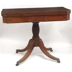 A Regency Mahogany Card Table, the shaped rectangular top on a turned baluster support and four sabre legs, brass caps and castors, 90 cm See illustration £300-400