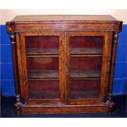A Regency burr Walnut, floor standing bookcase, the inlaid front with two glazed doors with ormolu decoration revealing a two shelf interior with all over velvet lining, the front doors flanked by reeded columns, 44".