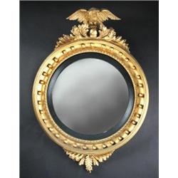 A Regency gilt framed convex wall glass, the circular plate within an ebonised slip and abacus frame surmounted with the figure of an eagle, 53cm wide £400-600
