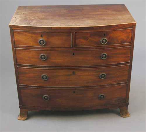 A Regency mahogany bow front chest of two short and three graduated long drawers on splayed bracket feet, 2ft 10ins £500-700