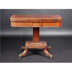 A Regency mahogany card table, the crossbanded rounded rectangular baize lined fold over top above a beaded tablet centred frieze supported on a spreading rectangular section column with reeded plinth base, standing on splayed legs with brass caps and castors, 92cm wide £600-800