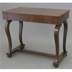 A Regency mahogany hall table, with two frieze drawers on scroll end supports with H stretcher an...
