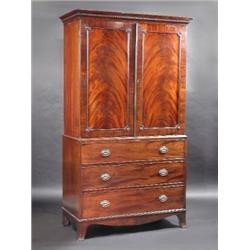 A Regency mahogany linen press, the upper section with moulded dentil cornice above a pair of round.