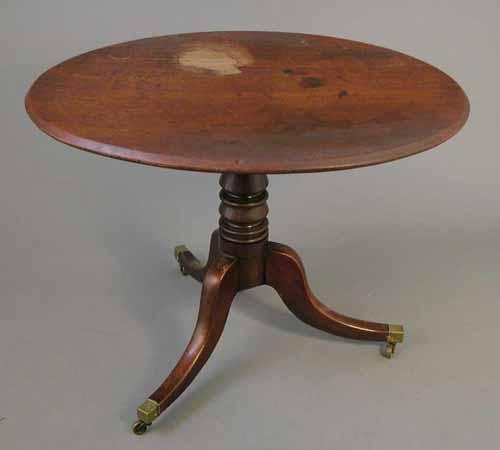 A Regency mahogany oval centre table, with turned column on splayed tripod base with brass terminals, 3ft 4ins £600-800