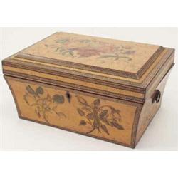 A Regency painted wood work box, rectangular with tapering sides and twin brass ring handles, painted with flowers and fretwork borders on a yellow ground, 15 ins. £200-300