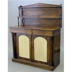 A Regency rosewood chiffonier, with architectural pediment shelved back, two drawers and two plea...