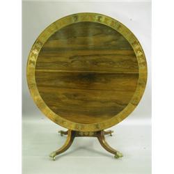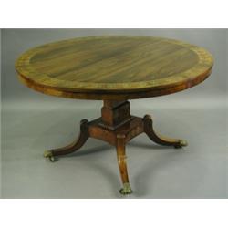 A Regency rosewood circular tilt top dining table, the crossbanded top with brass stringing an...