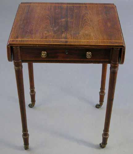 A Regency rosewood drop flap occasional table, fitted with a single drawer on slender ring turned legs, 1ft.8.5ins £700-900