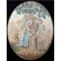 A Regency silkwork picture of Britannia, watercolour face, hands and sky, standing by a funerary urn adorned with a portrait bust, possibly that of Lord Nelson, ships at sea in the distance, in oval verre eglomise mount and rectangular glazed giltwood frame, 25 by 22 ins overall £400-600