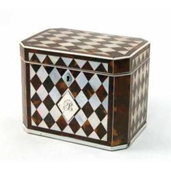 A Regency tortoiseshell and mother-of-pearl tea caddy, square shape with canted corners, geometric lozenge design throughout with silver escutcheon and initialled mount, 5.75in. £1,000-1,200