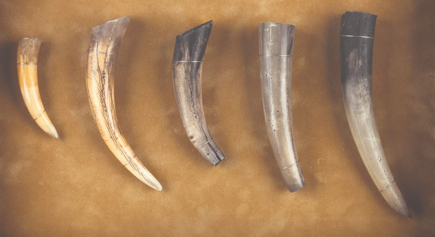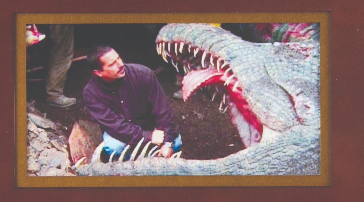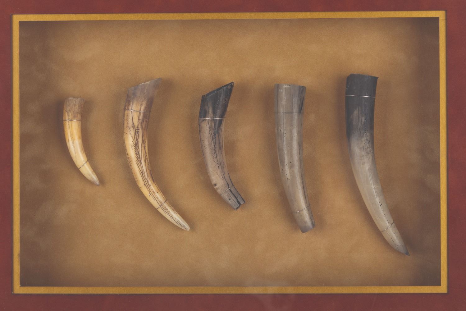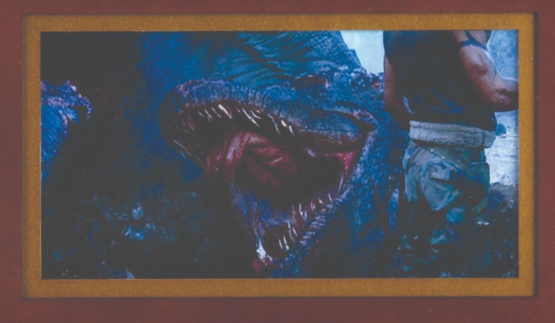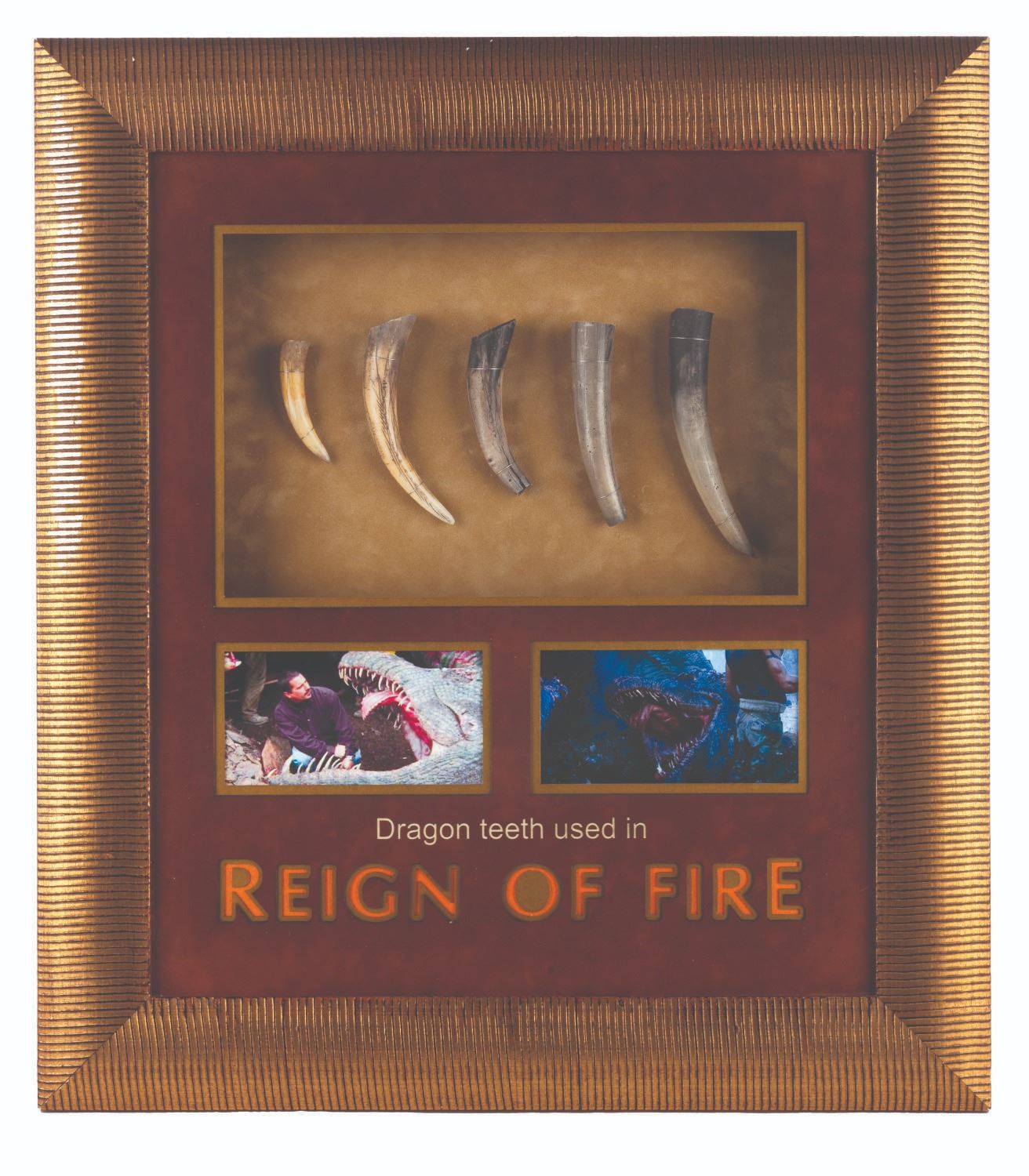 (Touchstone, 2002) A collection of five prop dragon teeth from “Reign of Fire” starring Matthew McConaughey and Christian Bale. The intricate teeth were used within a dragon's mouth, as shown in the production photo and film still presented in the frame. Ranging in size from 2.5” to 5.25” long, housed in a 19.5” x 22” custom frame, the teeth are in very good condition with wear from production use, while the frame displays in very good condition with scratches and scuffs.