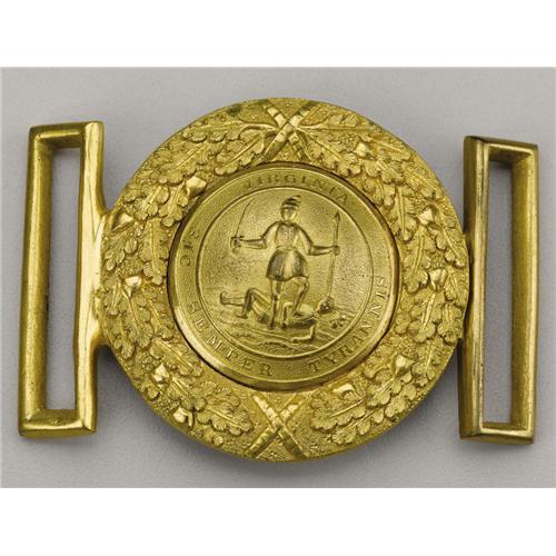 <B>A Remarkable Two-Piece Gold Virginia Confederate Belt Plate Belonging to Mosby Ranger C. F. Wood of Warrenton, Virginia </B></I> Rarely does a Confederate plate in this condition reach the market. This near-pristine gold-plated jeweler made buckle set is a museum piece in quality, as visually attractive as it is historically important. The central disk which is inserted into the receiving mechanism of the buckle is the Virginia state seal with "Virginia" above the figure of Virtus, the Roman goddess of virtue with the Latin motto "Sic Semper Tyrannis" when translated meaning "thus always to tyrants", appearing below the figure.<BR><BR>While there is some of the gilt having been rubbed from the clothing of the figure of Virtus, the overall condition of the disk portion of the buckle is magnificent. Virtus stands in a victorious pose with her foot ceremoniously on top of the defeated tyrant whose crown has fallen from his head. A variant of the 1776 approved design is still in use as Virginia's state seal today. There is an inspector's mark '3' on the obverse of the buckle beside the disk next to the rectangular attachment where a leather belt would be attached.<BR><BR>The receiving device of the buckle is a magnificent oak wreath, intricately engraved and broken at the top and bottom by ribbons forming two St. Andrew's crosses. This part of the buckle incorporates the rectangular portion where the leather belt would be attached. Inside the interior of the oak wreath where the disk is inserted is another, separate inspector's mark of a reversed '4'. The plate measures 80mm x 50mm and is similar to Plate 418 in <I>Confederate Belt Buckles and Plates</B></I> by Steve E. Mullinax. A letter of authenticity from Mullinax accompanied this buckle.<BR><BR>This is a highly treasured gold Virginia Confederate two-piece belt buckle in almost unseen, fine condition.<BR><BR><B>Provenance:</B></I><I>The Tharpe Collection of American Military History</B></I><BR><BR><B>Exhibited:</B></I> <I>The Liberty Heritage Society Museum</B></I><BR><BR><b>Shipping:</b> Miscellaneous Collectibles, Smal (<a target="_blank" href="http://www.heritageauctions.com/common/shipping.php">view shipping information</a>)