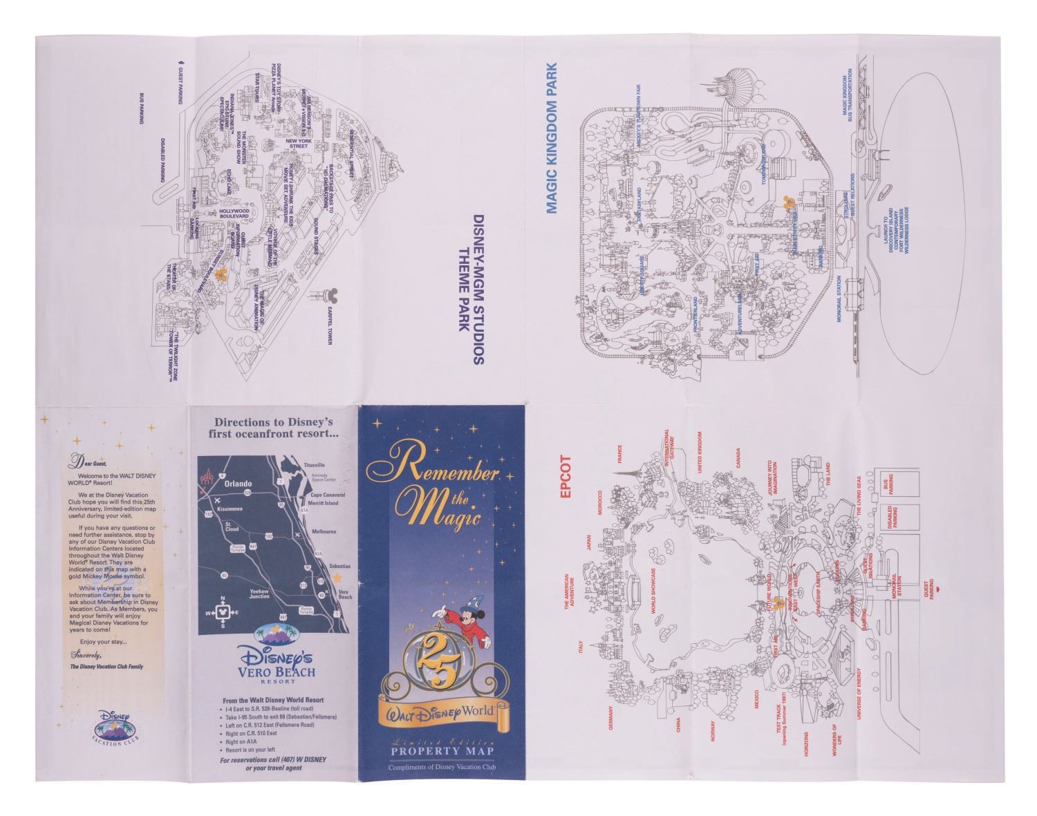 (Walt Disney World, 1996) A limited edition "Remember the Magic" Walt Disney World Property Map. The two-sided map brochure was courtesy of the Disney Vacation Club and depicts Walt Disney World Resort on one side and Magic Kingdom, EPCOT, and Disney-MGM Studios Theme Park on the revere. Measuring 18"x23", the map is in very good condition with a .5" tear on one fold line, few creases, and little wear.