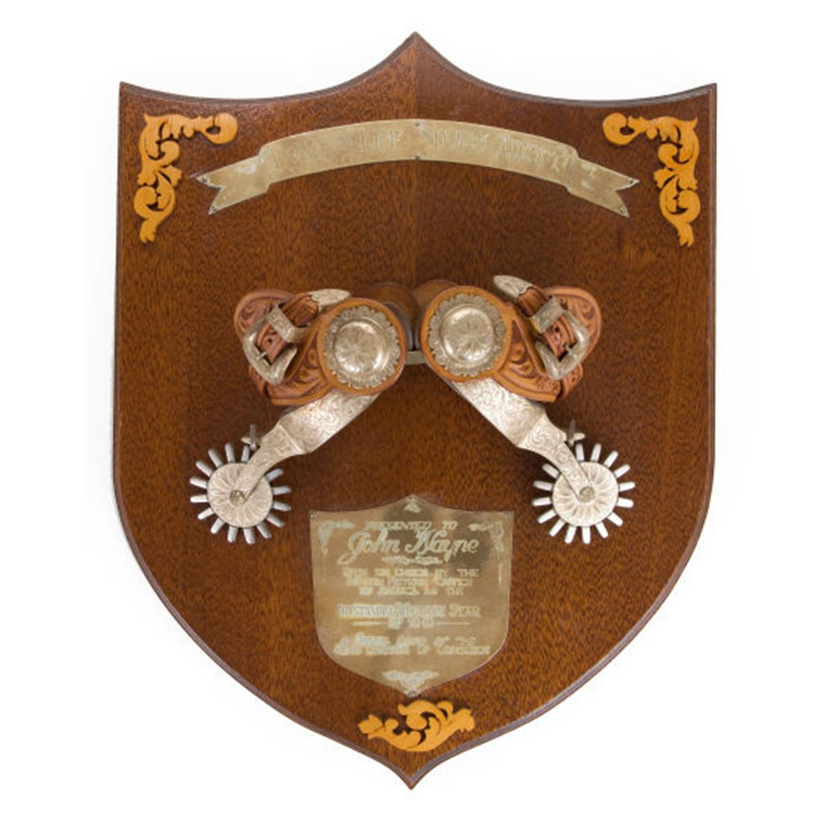A 'Reno Silver Spurs' Award, 1949. Presented to John Wayne; from the Reno Chamber of Commerce and the Motion Picture Critics of America for "Outstanding Western Star of 1949;" included is a reprinted color image showing this piece in situ in Wayne's Newport Beach office.18" x 15"