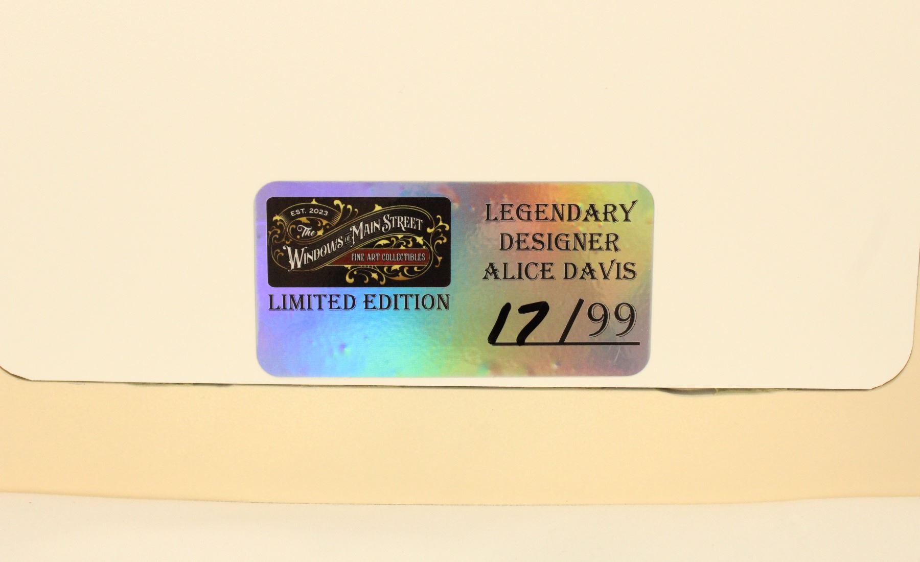 This is a Main Street Heritage Collectibles 1:1 scale replica of the Main Street window that honors Alice Davis found on Main Street, U.S.A., Disneyland . It uses the same design and build methods as the Bob Gurr replica that sits in Bob Gurr's house. It is limited edition #17 of 99, comes new in box!