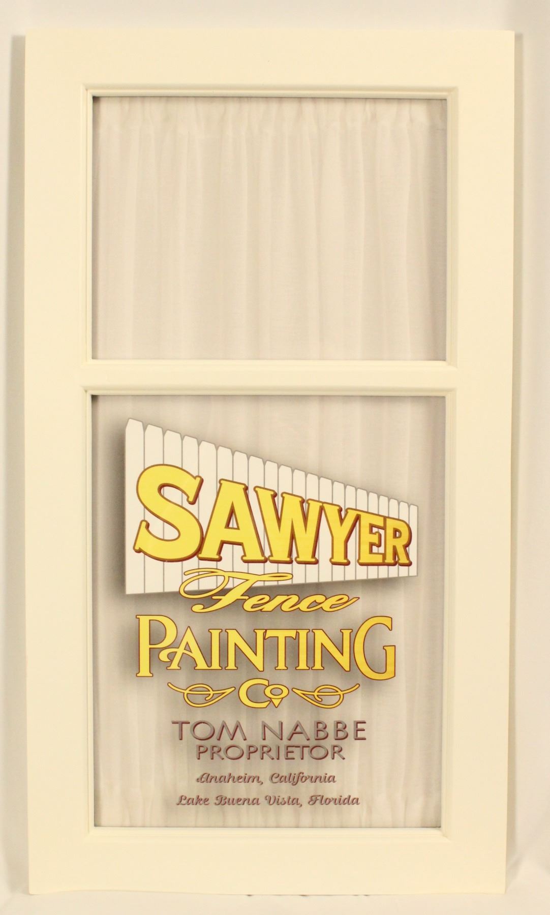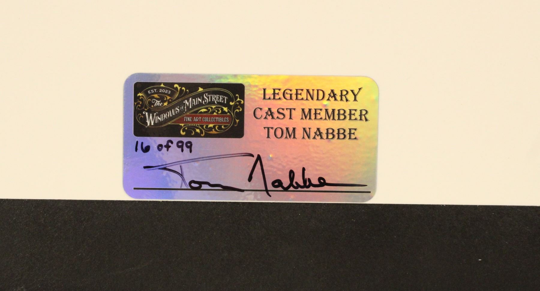 This is a Main Street Heritage Collectibles 1:1 scale replica of the Main Street window that honors Tom Nabbe found on Main Street, U.S.A., Magic Kingdom . It uses the same design and build methods as the Bob Gurr replica that sits in Bob Gurr's house. It is limited edition #16 of 99, comes new in box, and is autographed on the back by Disney Legend Tom Nabbe! It measures 15" W x 28" H. A COA or LOA can be provided by Signature COA of Orlando for an additional fee.