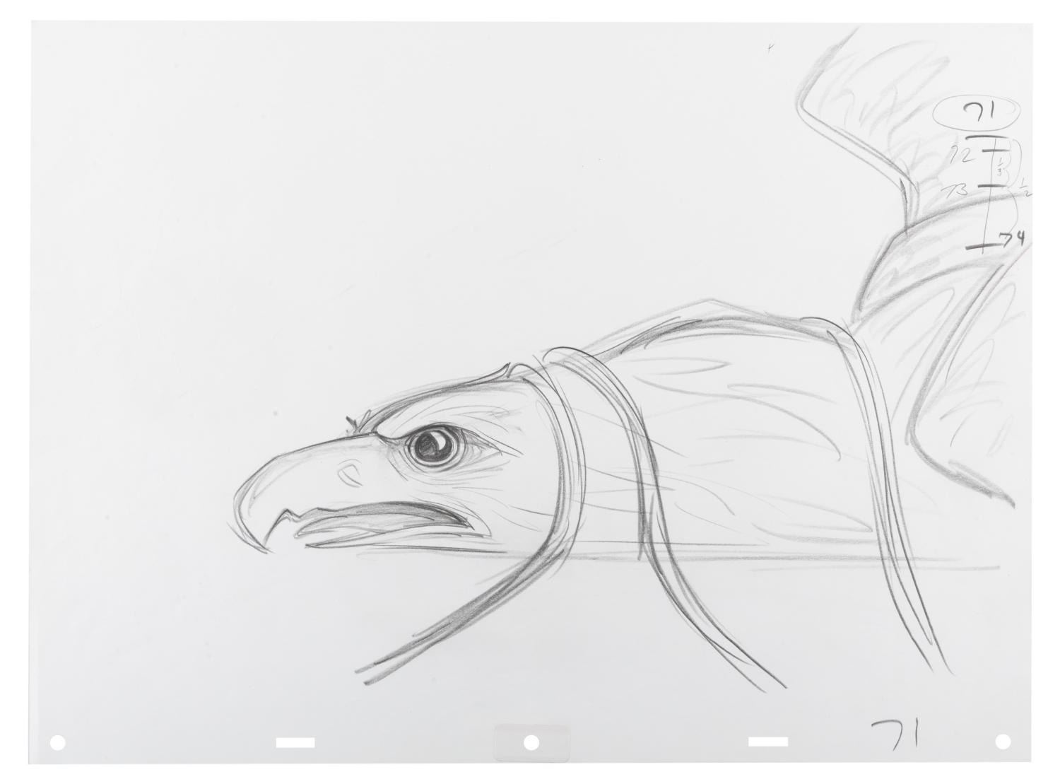 (Disney, 1990) An original production drawing of Marahute the golden eagle from “The Rescuers Down Under.” Marahute has an image size of 11” x 13.5” on 12.5” x 17” animation paper. The pencil drawing is in very good condition with light creasing and pencil notes in the upper and lower right corners.