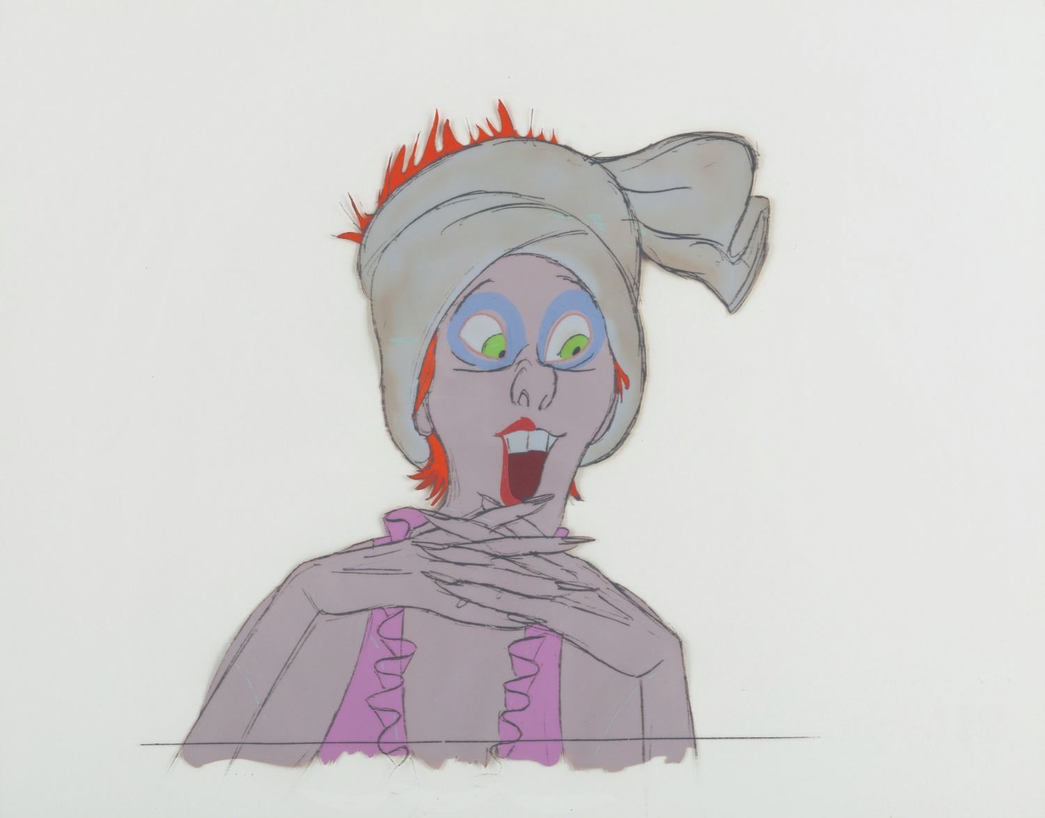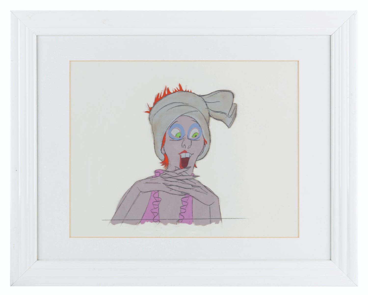 (Disney, 1977) An original production cel of Madame Medusa from "The Rescuers.” Madame Medusa has an image size of 8” x 8.5” on a 10.5” x 13.5” visible cel. The entire framed and matted piece measures 16.5” x 20.5”. The cel is in good condition with light stains, scratches, and warping. The frame is in good condition with scratches, scuffs, and wear.