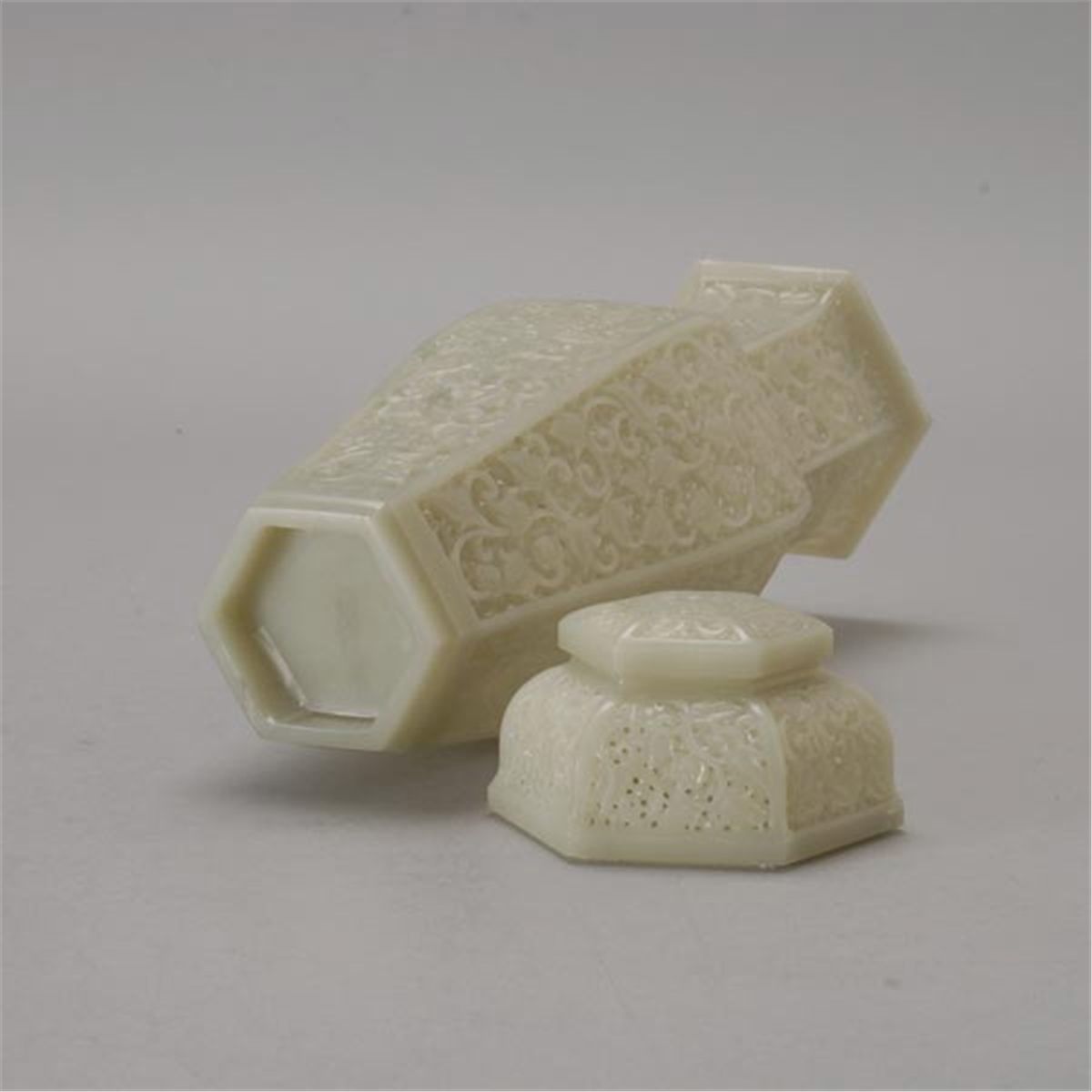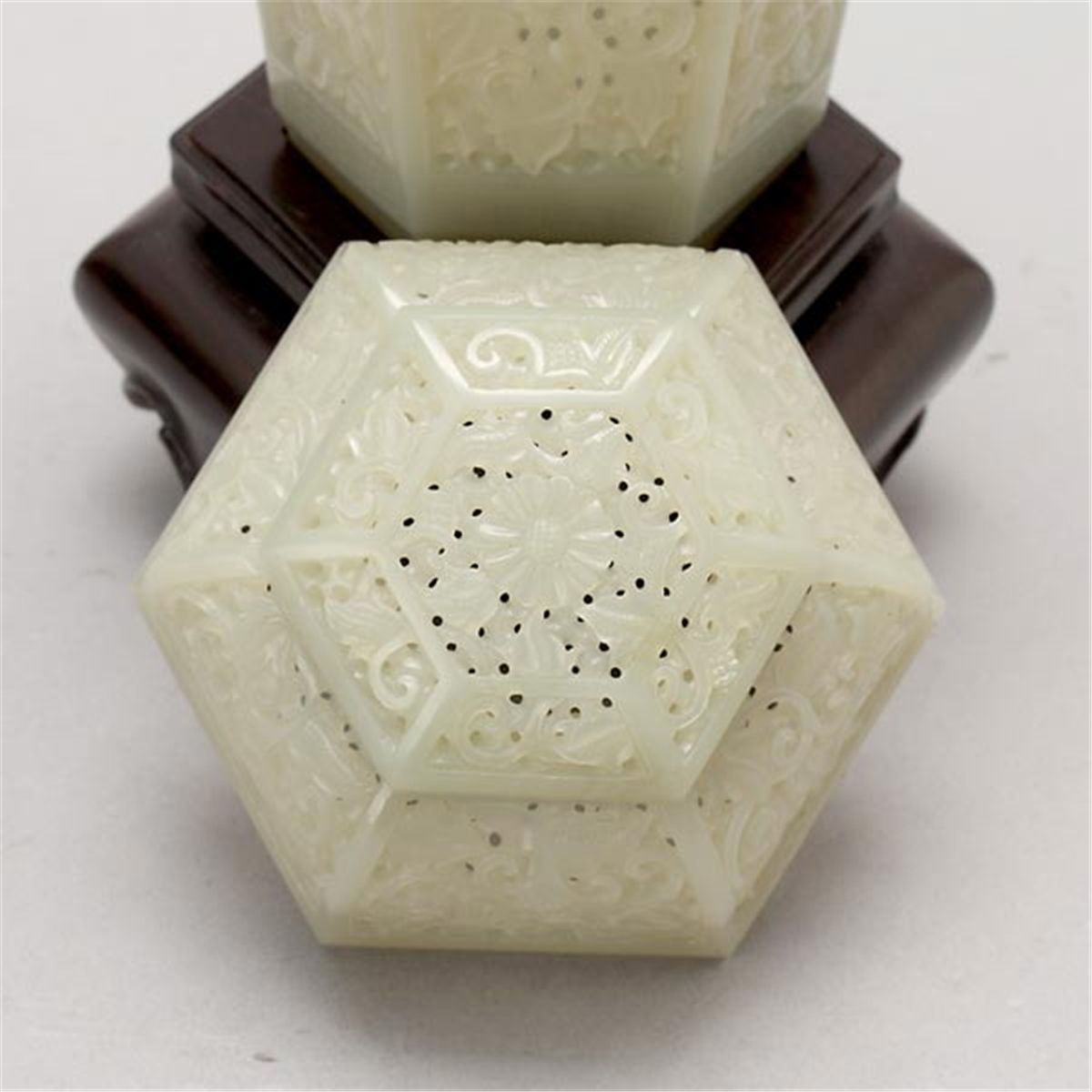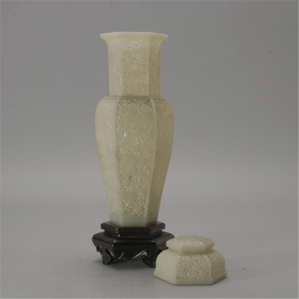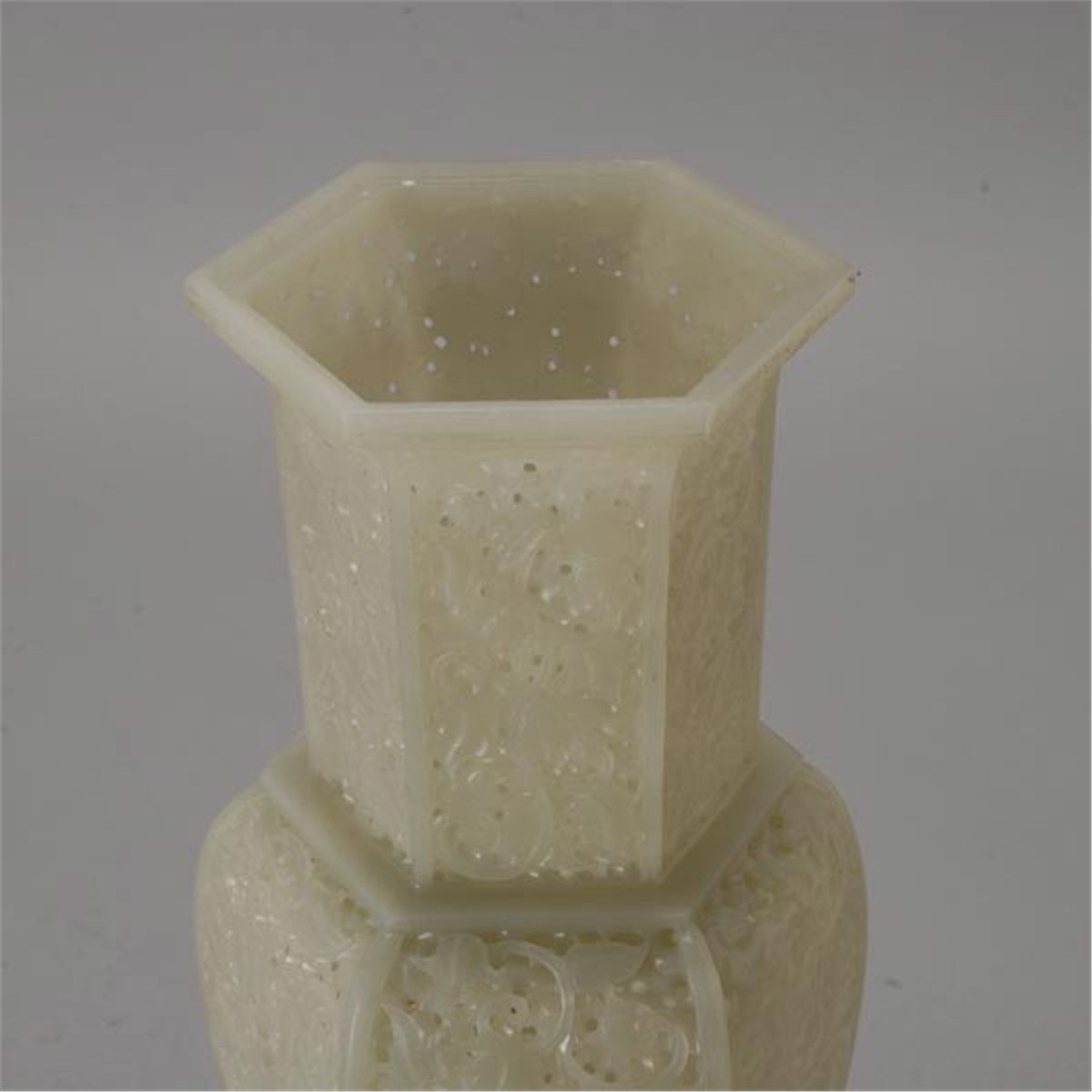 A Reticulated White Jade Hexagonal Covered Vase, Of hexagonal baluster form, reticulated with mythical beasts and scrolling floral decorations, the stone of pale celadon tone, with wood stand. Height with Cover: 13 1/4 inches (33.7 cm) [Chips. This condition report states major condition issues only.]