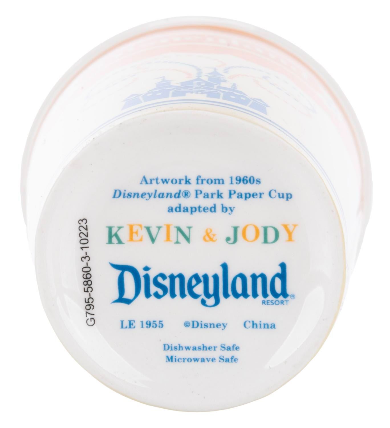 (Disneyland, 2010) A limited edition ceramic cup by Kevin Kidney and Jody Daily for Disneyland's 55th anniversary. This cup was designed after the iconic Disneyland paper cups from the 1960s, and created in a limited edition of only 1955. The cup measures 3.5" in diameter and 4.25" tall, and is in fine condition. This item comes with its original box and packaging.