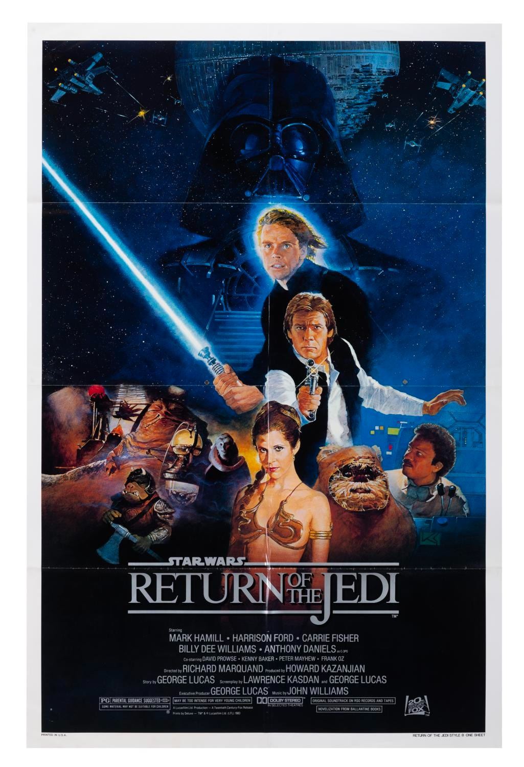(20th Century Fox, 1983) A Style B one-sheet for “Return of the Jedi,” the final film in the original Star Wars Trilogy. Measuring 27” x 41”, the poster displays in very good condition with light creases, scuffs, and wear along the original folds.
