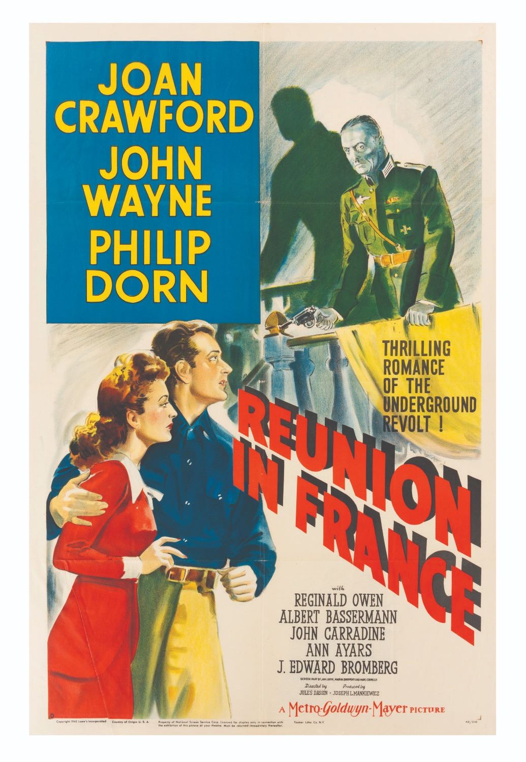 (MGM, 1942) An original release one-sheet for "Reunion in France" starring Joan Crawford, John Wayne, and Philip Dorn. Measuring 27" x 41", the poster is in good condition with separation at the cross folds, a 10” crease to the lower left, a light 4” crease to the upper left, and discoloration from age.
