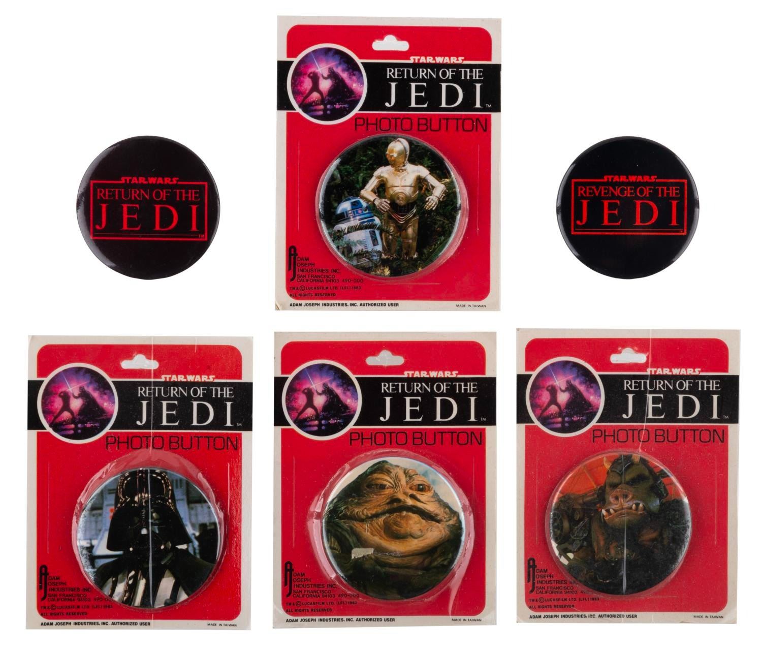 (Adam Joseph Industries, 1983) A collection of four “Return of the Jedi” photo buttons on the original cards, plus loose buttons of the title and original “Revenge of the Jedi” title. Each measuring 2” in diameter the buttons are in fine condition, with the cards overall very good with some edge wear.