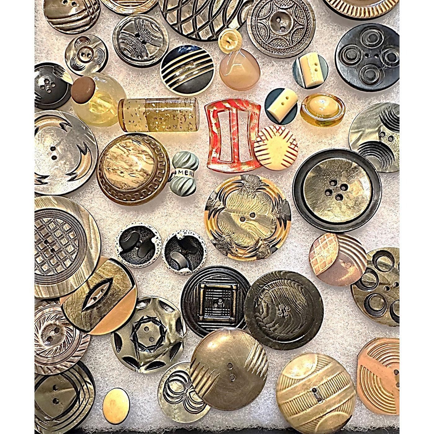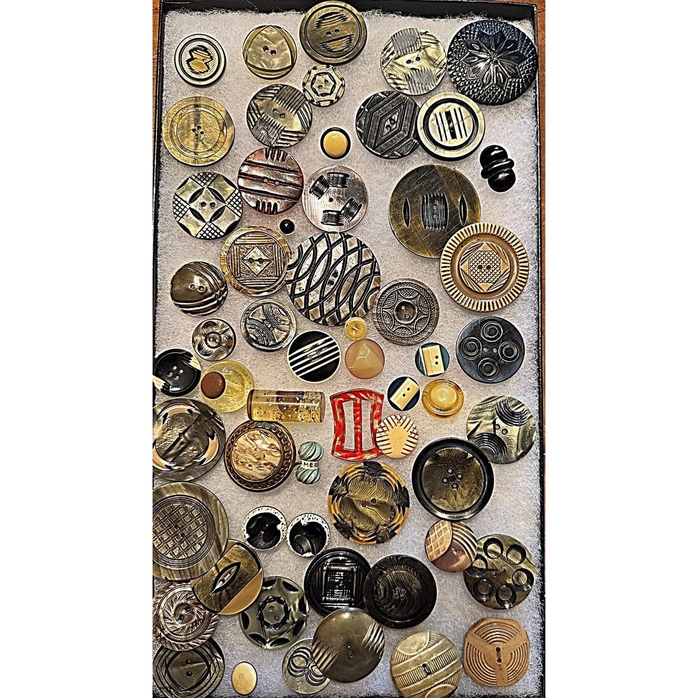An assortment of various sizes and kinds of celluloid buttons. This Riker tray (included) consists of assorted cookie types, tight tops, and more.