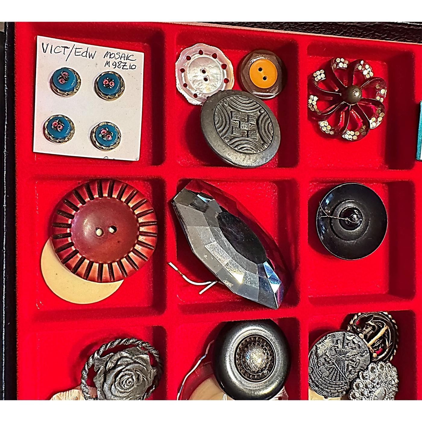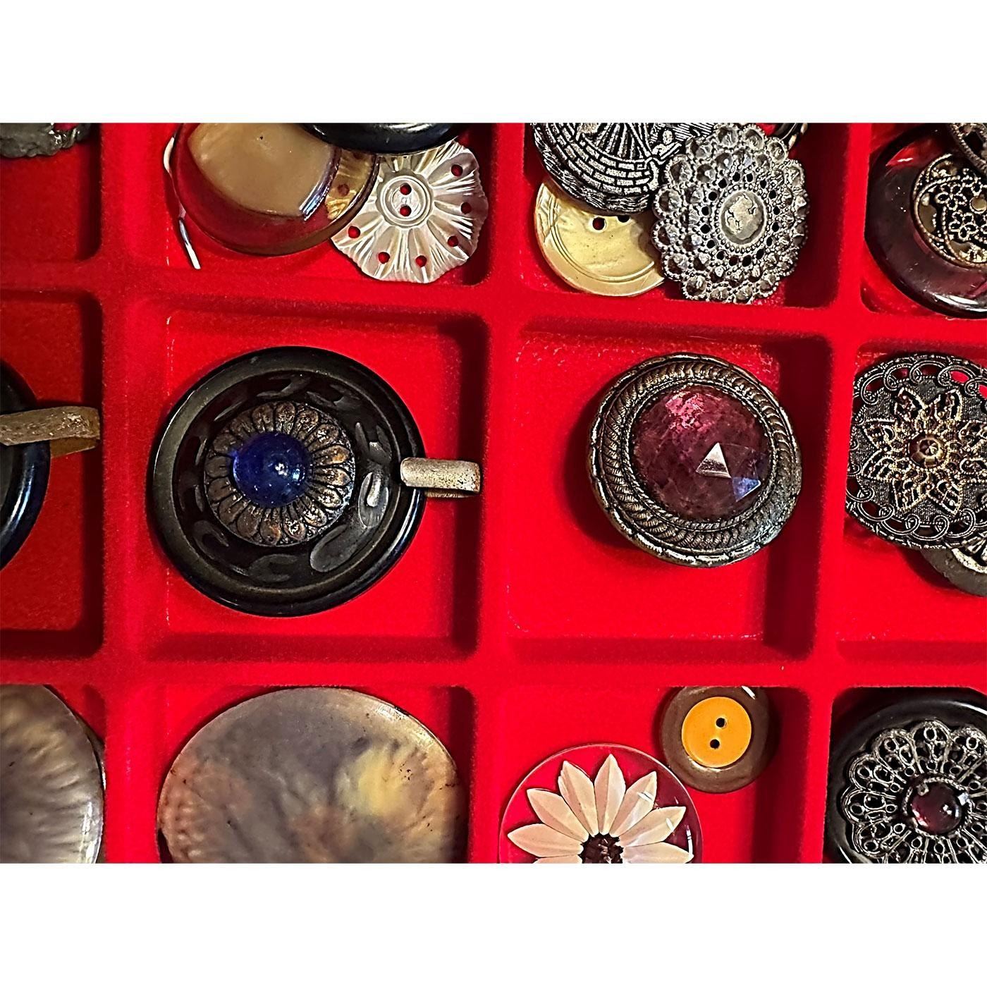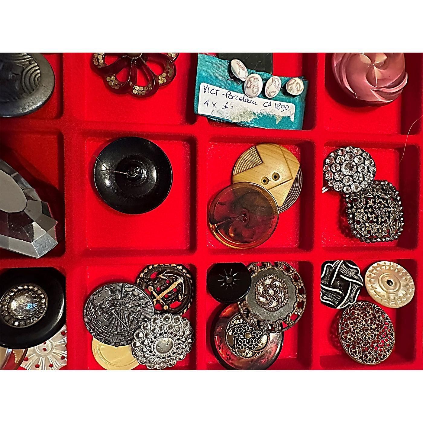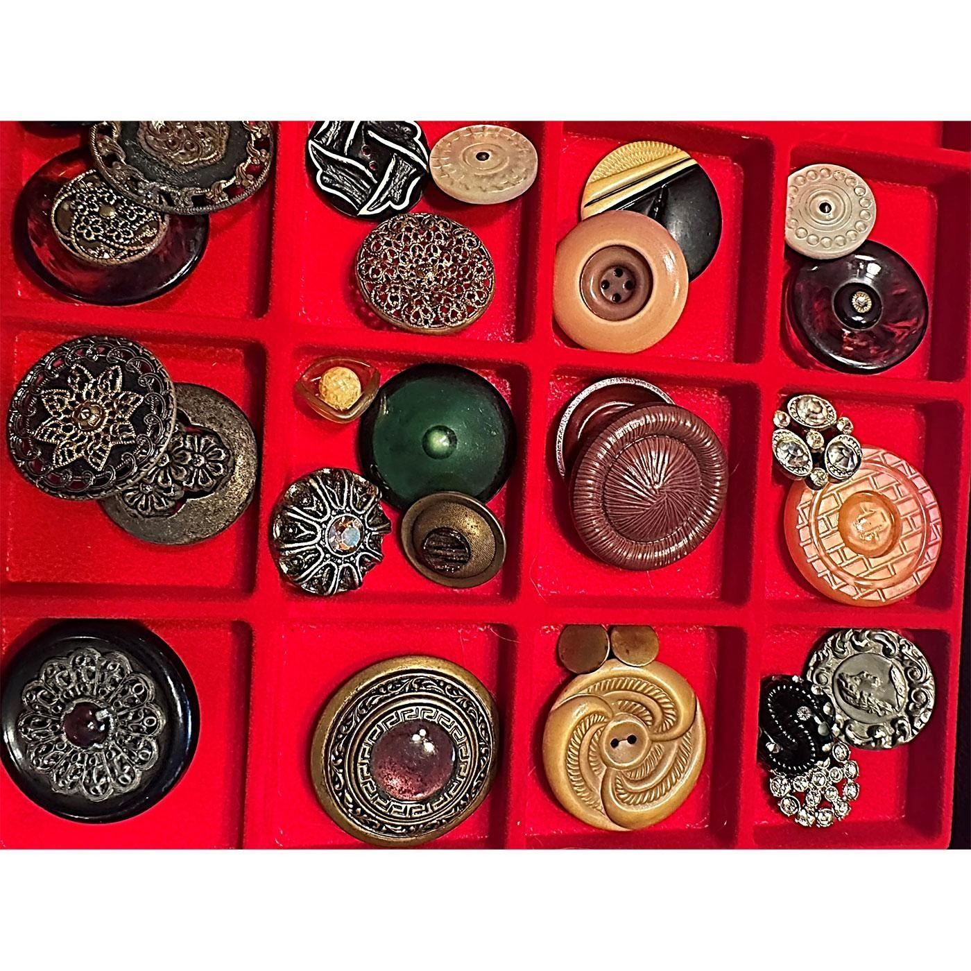 A large assortment of sizes, ages and materials. This Riker tray (included) consists of an assortement of Bakelite including jeweled, celluloid and other plastics, black glass, metals and more.