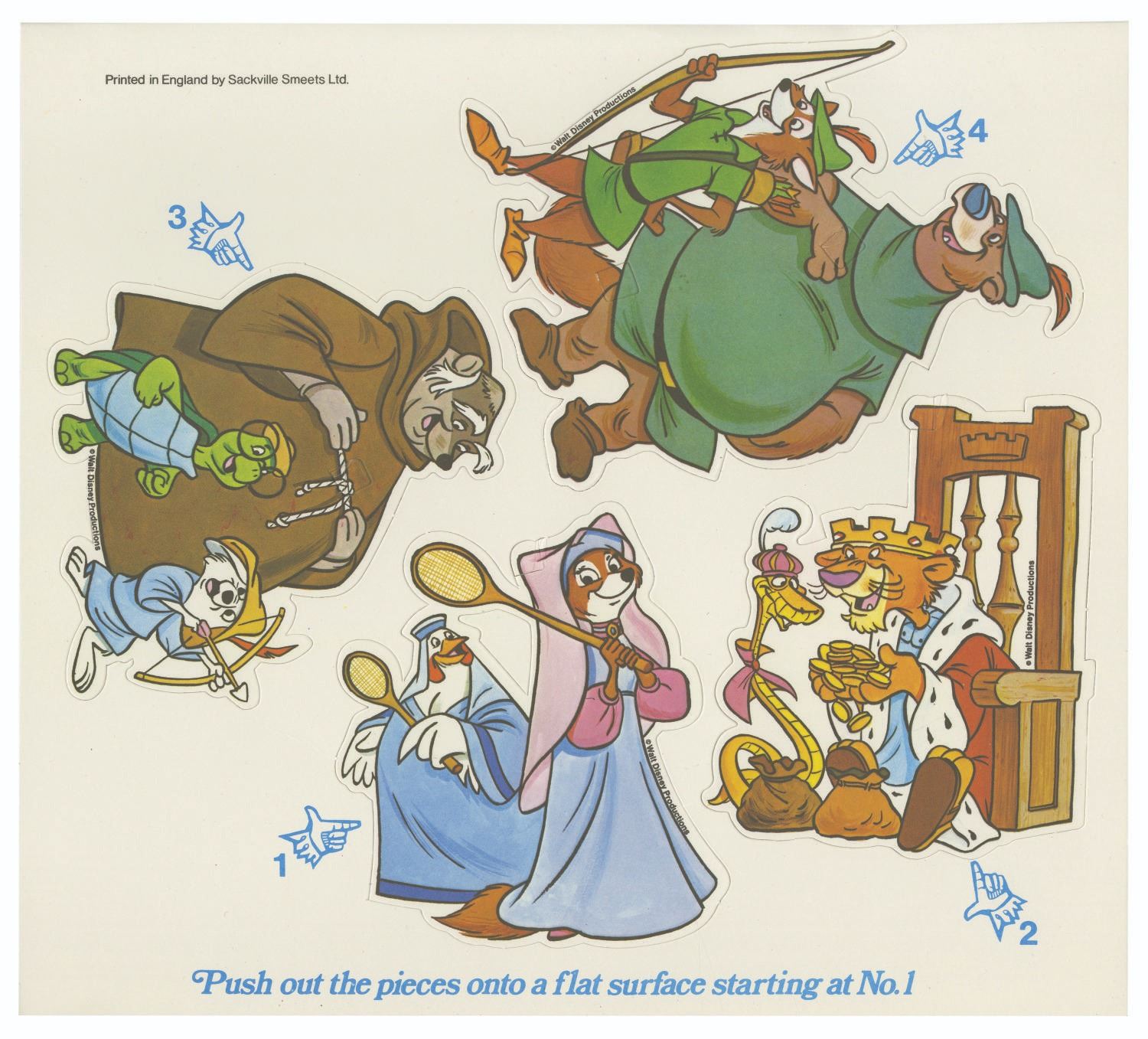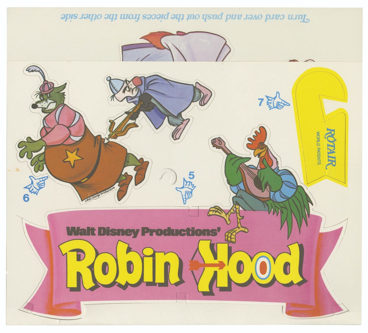 (Disney, 1970s) An unused punch-out mobile for “Robin Hood” meant for theater lobby display. All of the pieces are attached to each other with monofilament line and should hang properly once they are punched. Measuring 10.75" x 12" in the folded backing, the mobile is in very good condition with a couple of spots of minor tearing. Due to age, some of the pieces have partially separated from the backing.