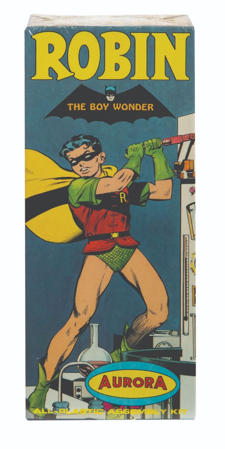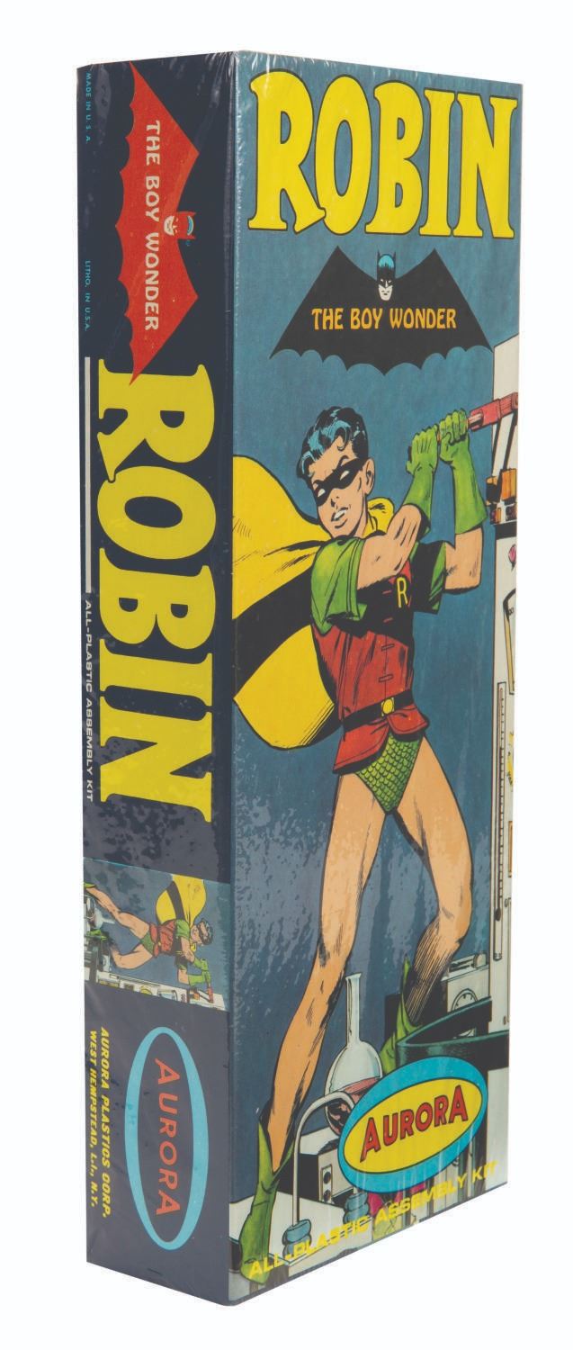 (Aurora, 1966) A factory-sealed model kit of Robin, The Boy Wonder. The illustration is an excellent Silver Age depiction of Batman’s loyal sidekick and ward, Dick Grayson. This original model proved so popular that it was re-released by Aurora in 1974, and again by Revell in 1999. Measuring 13.25" x 5.25" and 2.25" deep, the item is sealed in cellophane from the factory and in very fine condition. Labeled Aurora Kit No. 488-98.