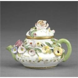 A Rockingham compressed pear shaped miniature teapot and cover, encrusted with flower sprays, floral knop, 4in wide, griffin mark in puce