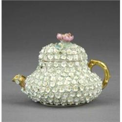 A Rockingham squat pear shaped miniature teapot and cover, encrusted with florets and with floral knop, gilt branch handle and spout, 4in wide, griffin mark in puce