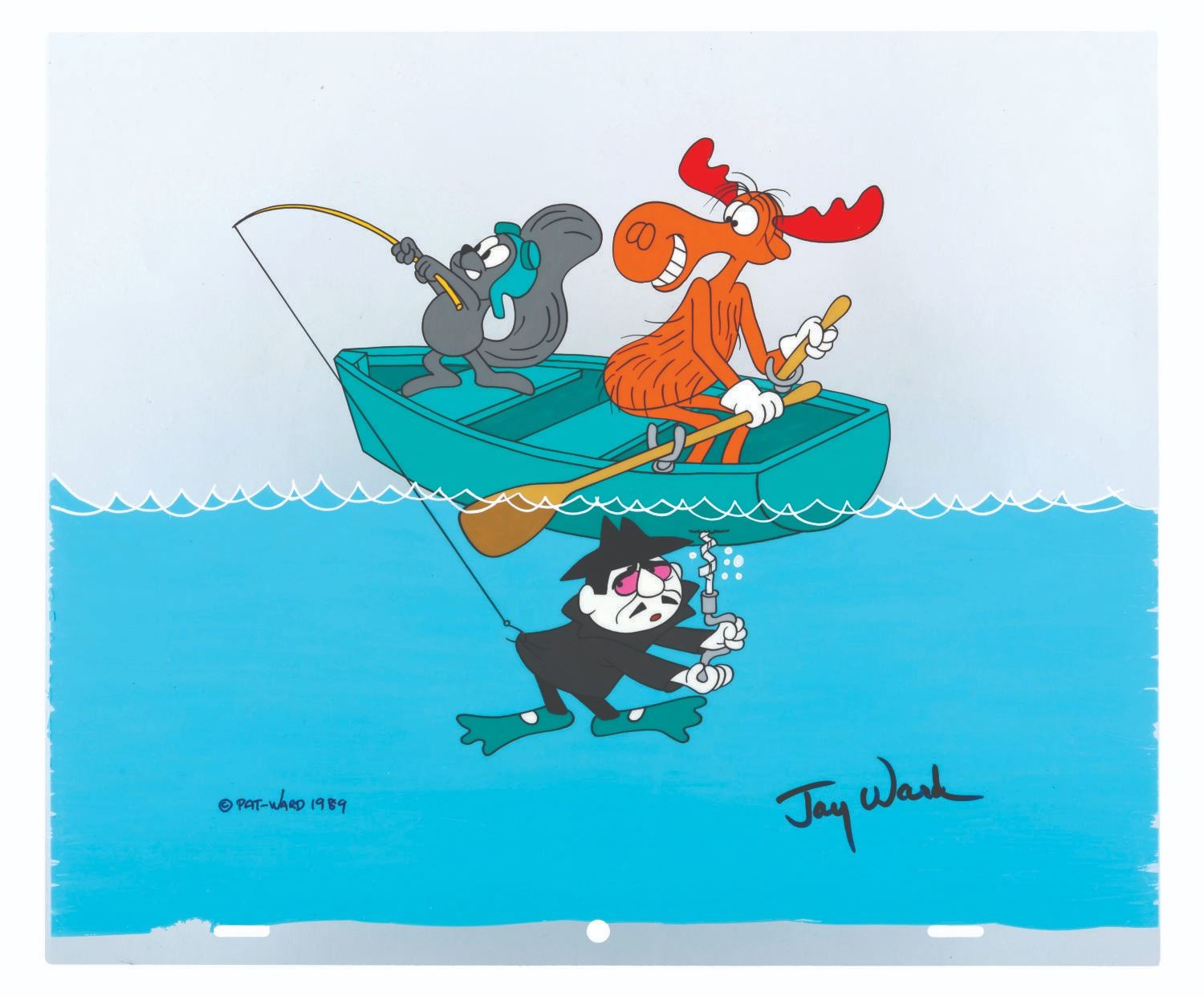 (Ward, 1989) Scene Cel #29 in the Jay Ward Productions Original Animation Scene Cels Collection, featuring Rocky, Bullwinkle, and Boris Badenov, signed by Ward in black ink. With a character image size of 8.75” x 12.5” on a 10.5” x 12.5” cel, the piece is in very good condition with light scratches and spots of paint loss.
