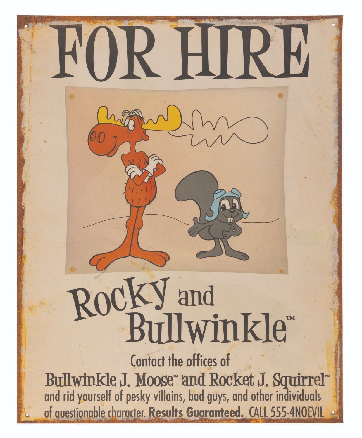 (Ward, 2004) A tin sign of a collectible Rocky and Bullwinkle For Hire sign, displayed at the Dudley Do-Right Emporium. Measuring 12” x 15”, the sign displays in fair condition with wear throughout including heavy oxidation around the edges.
