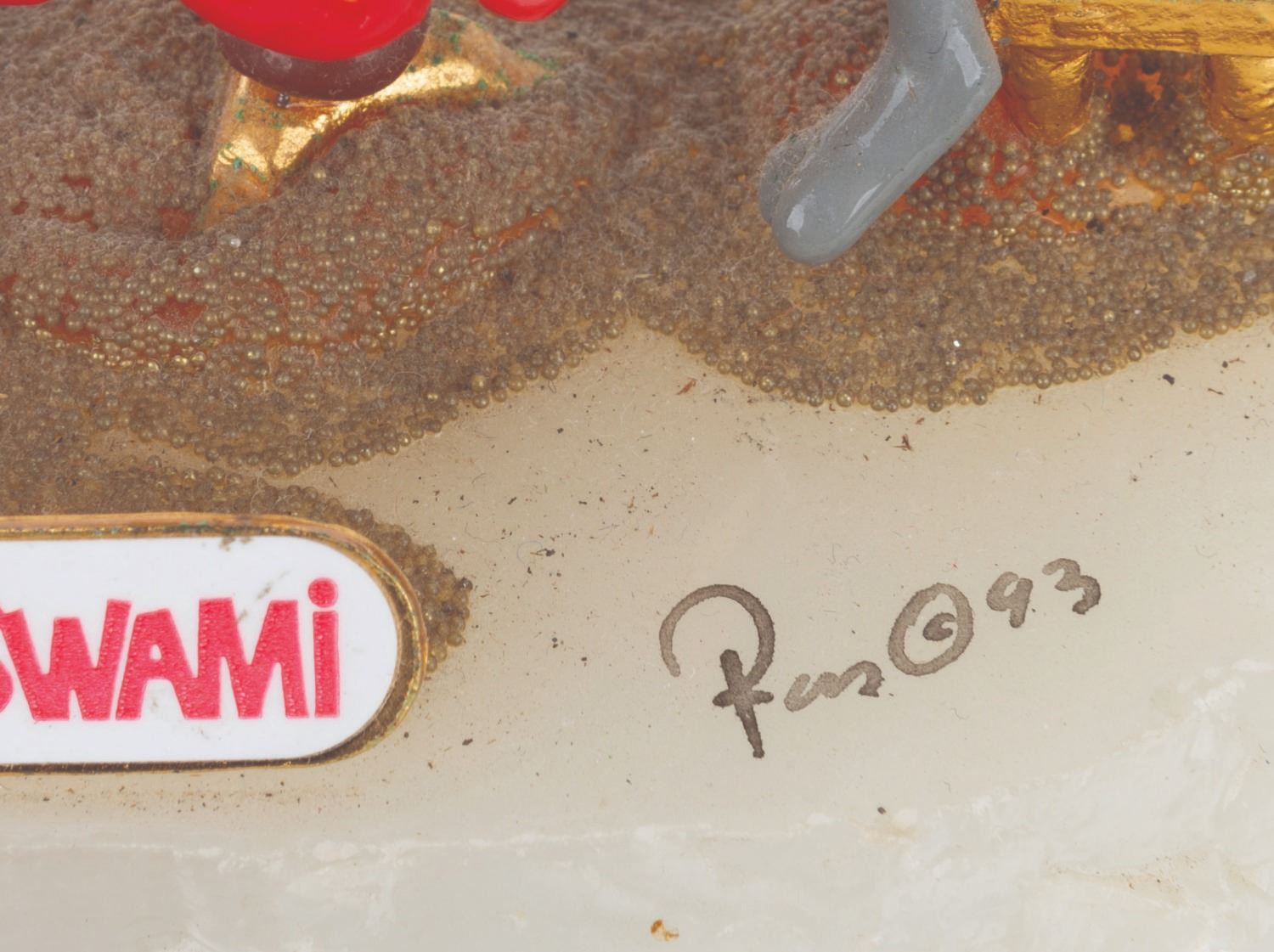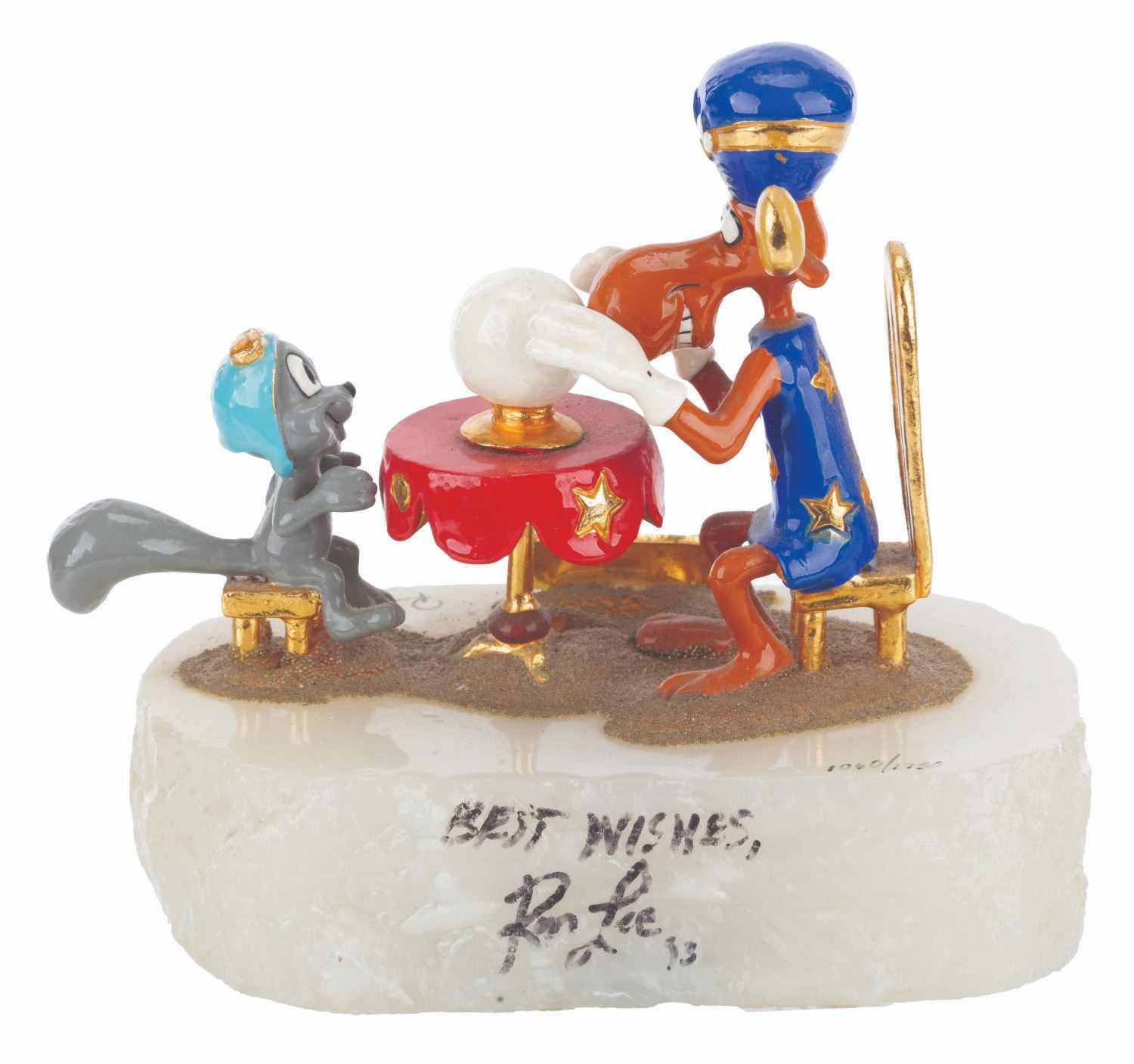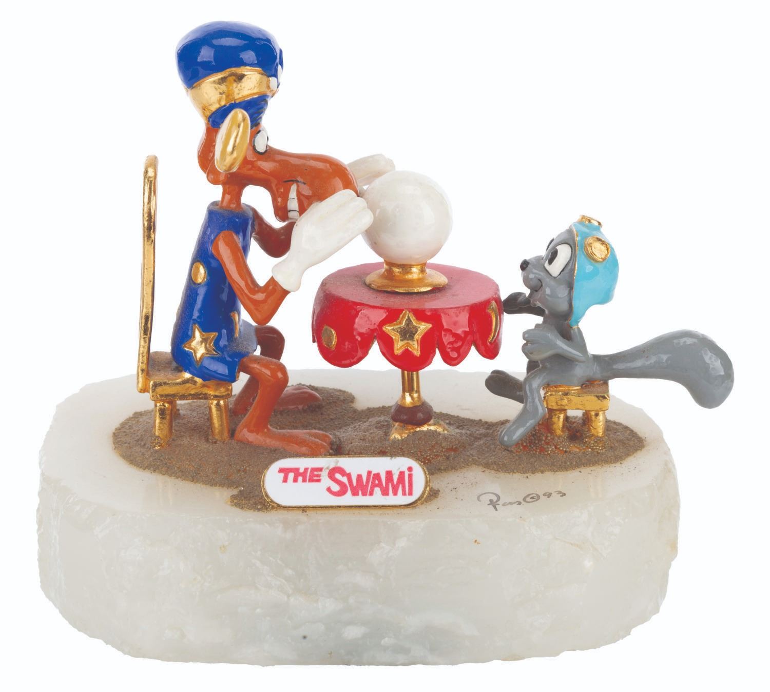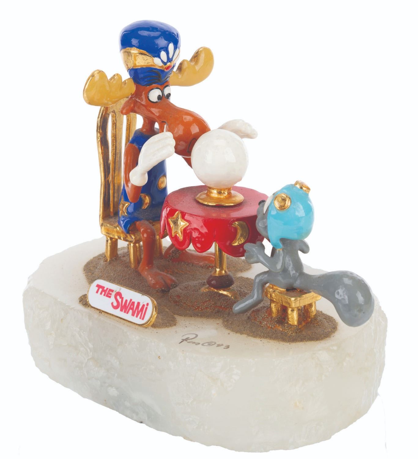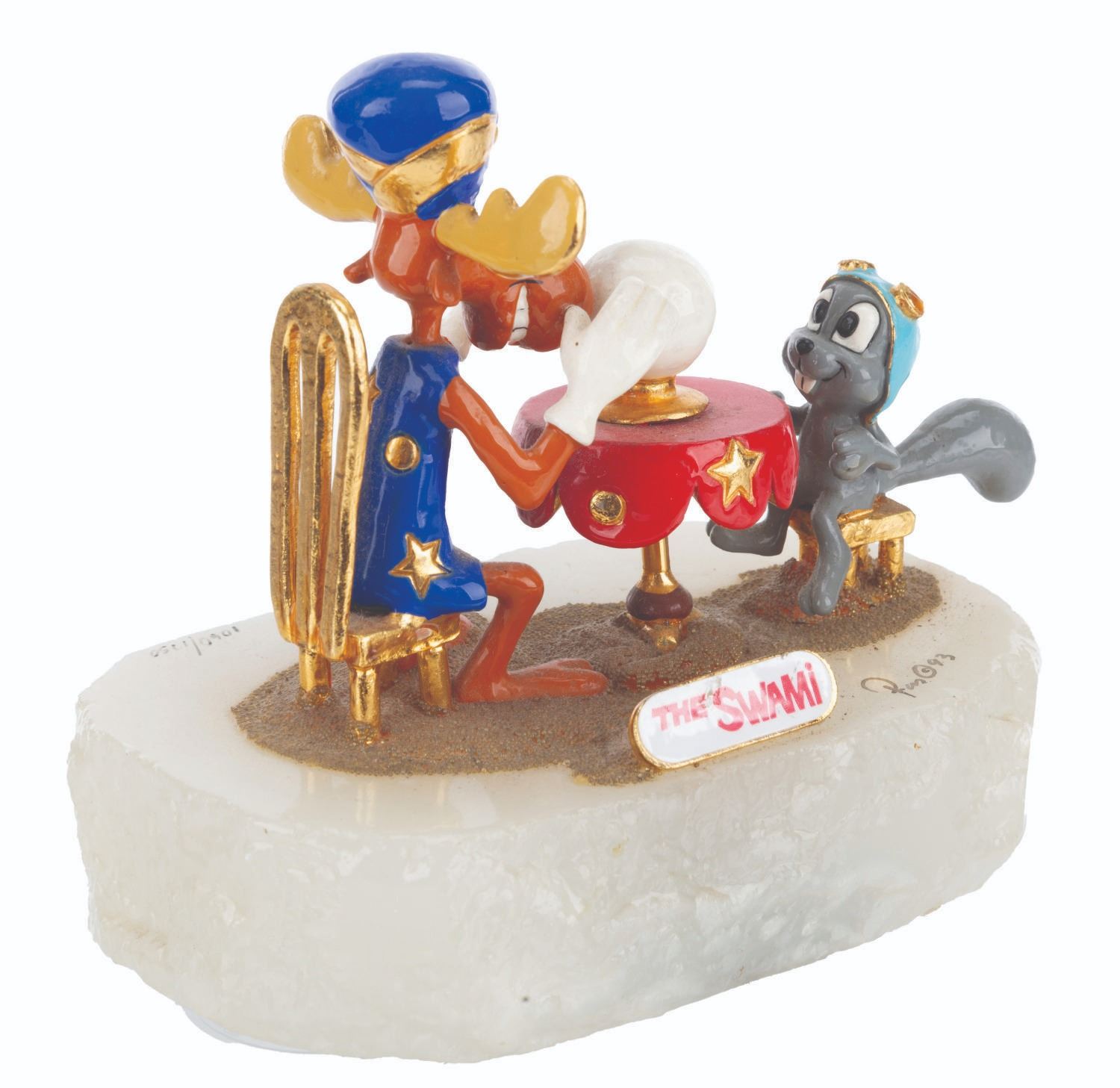(Ron Lee, 1993) A pewter sculpture of Rocky and Bullwinkle titled “The Swami,” produced by Ron Lee. The sculpture was released in an edition size of 1750, with this one hand-numbered 1060/1750, signed, and dated by Lee on the quartz base in black marker. Measuring 5.5” x 3.75” x 5” tall, the piece is in very good condition with light wear.