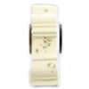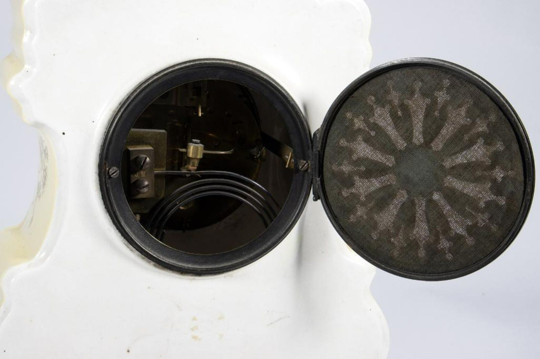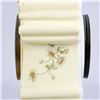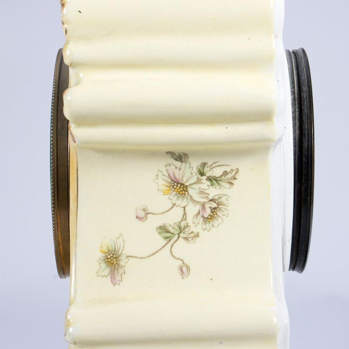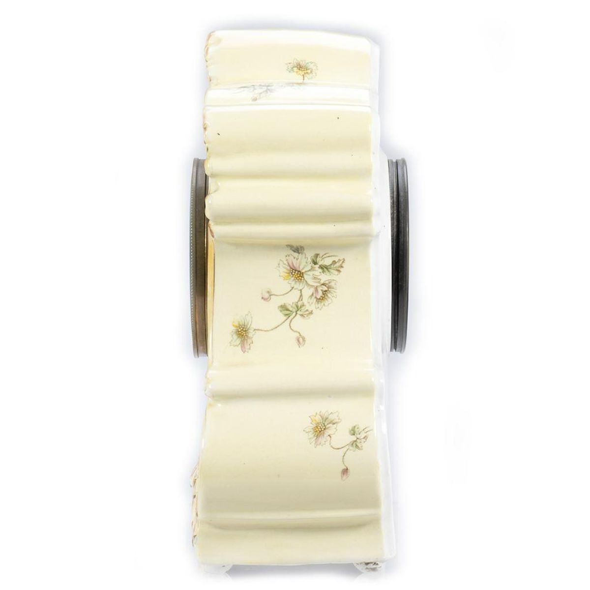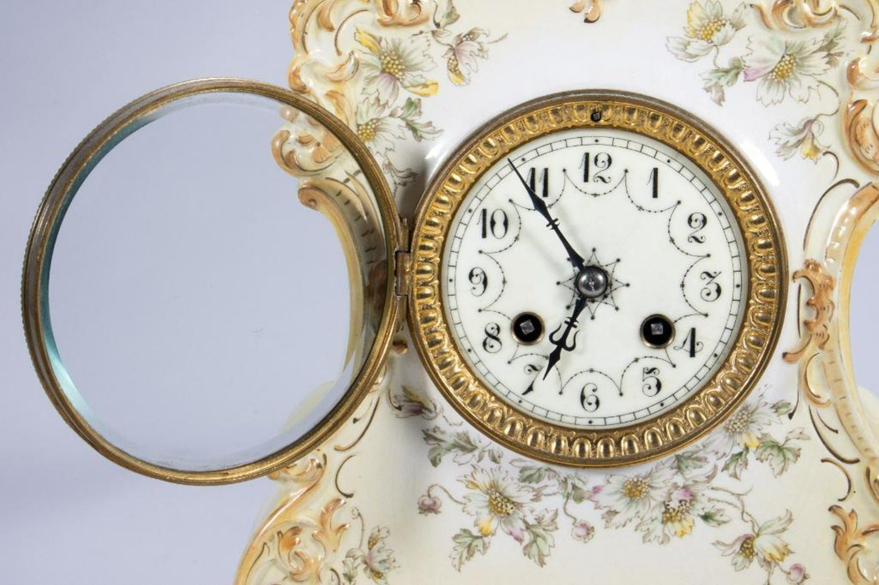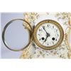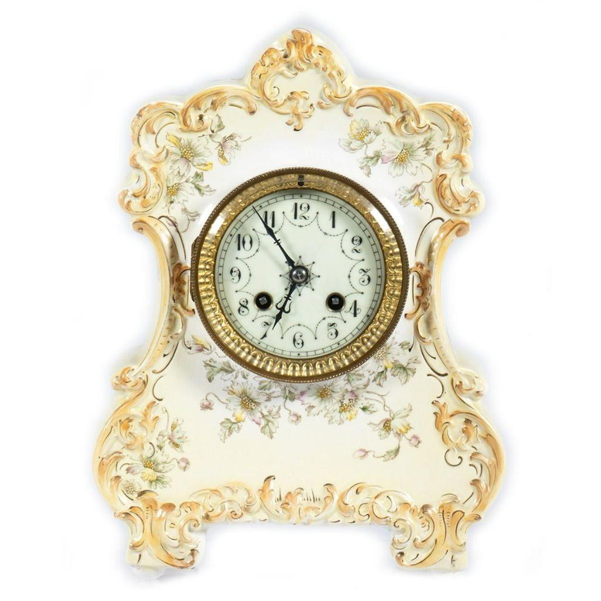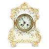 The porcelain case decorated with gilt scrolls and wild flower garlands. The clock face with painted Arabic numerals and minute chapter ring. 11in. h. 9in. w. Condition: Very good, no chips or cracks to the case. Clock works not warranted.