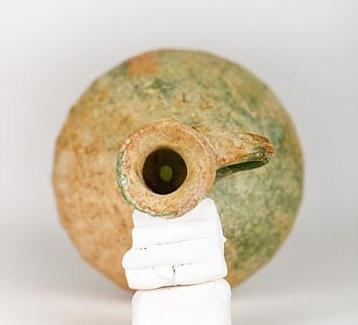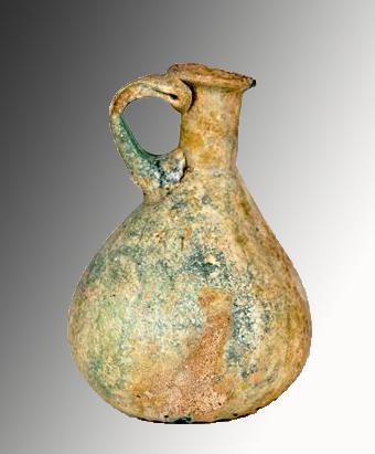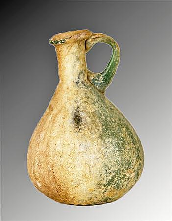 Rome, ca. 2nd to 4th AD/CE. Very rare example of a single handled pitcher also being a sprinkler flask; with inner diaphragm at the junction of neck and body. Mouth-blown with 20 ribs radiating upward from the pontil mark on base to make a gracefully ribbed pitcher; handle applied separately at the end of the process. Rear of vessel shows the original rich green glass color; front has milky oxidation/ iridescence that fortuitously occasionally occurs with this type of glass. Scholars sometimes call this rare type a “squash glass” which is apparent when viewing the piece from beneath. 5-1/2"H (14cm).